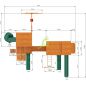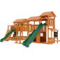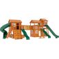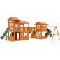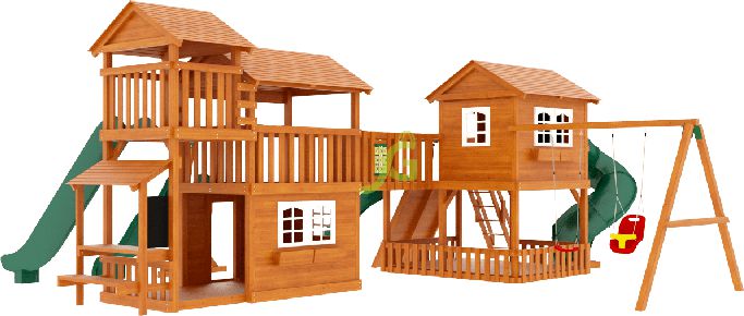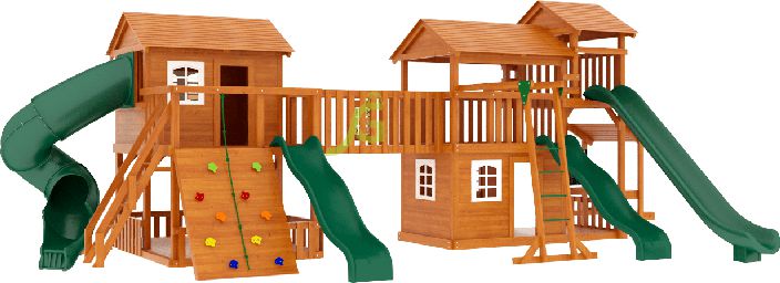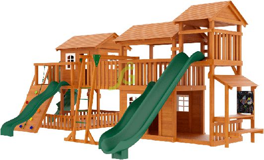 Просто огромный комплекс для детей красиво впишется в ландшафт загородного дома, его стильные башенки с белыми окошками на фоне сочной зелени украсят ваш сад. А самое главное, множество развлечений надолго отвлекут детей от вредных гаджетов, позволят выманить малышей-домоседов на свежий воздух. Разнообразные спортивные снаряды гарантированно будут воздействовать на все группы мышц мальчишек и девчонок. Ведь в площадке есть рукоход, скалодром, канат, лестницы и 4 горки для самых отважных. А для романтичных принцесс и творческих натур предусмотрены разного вида качели, доска для рисования, игра «крести-нолики» и игровой прилавок.