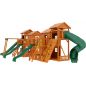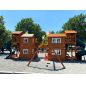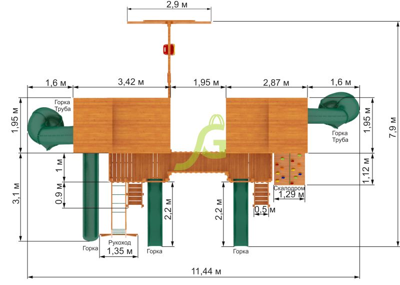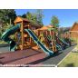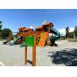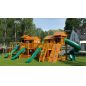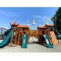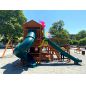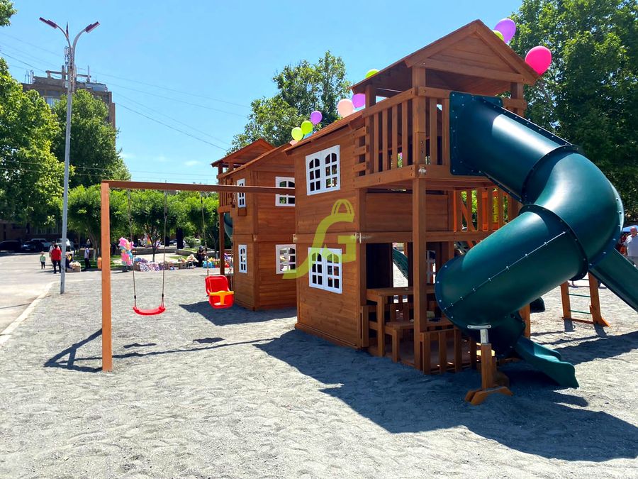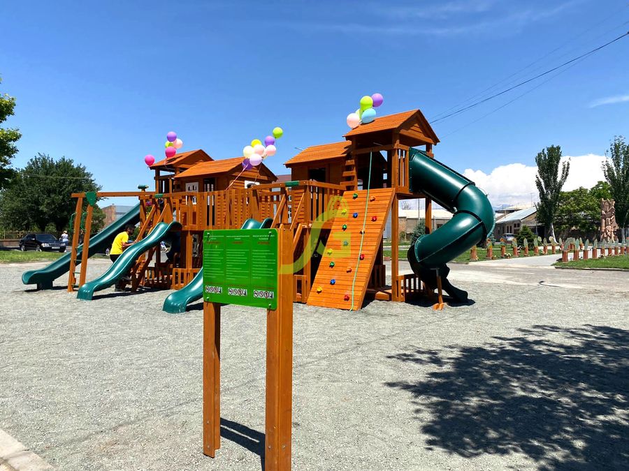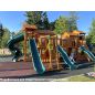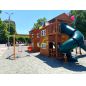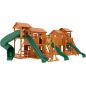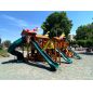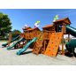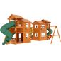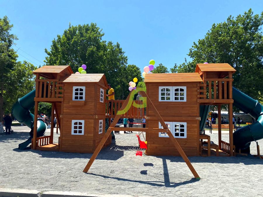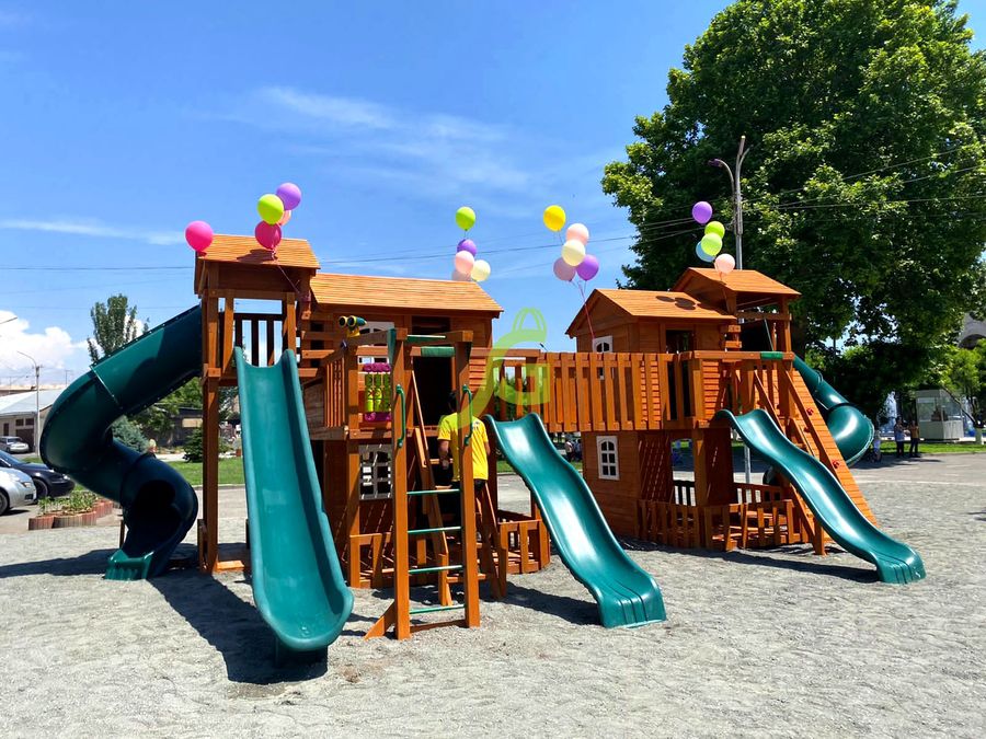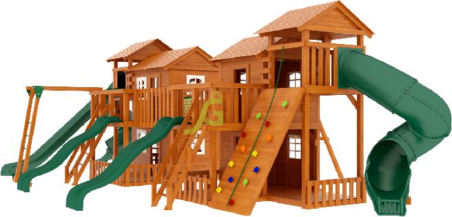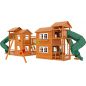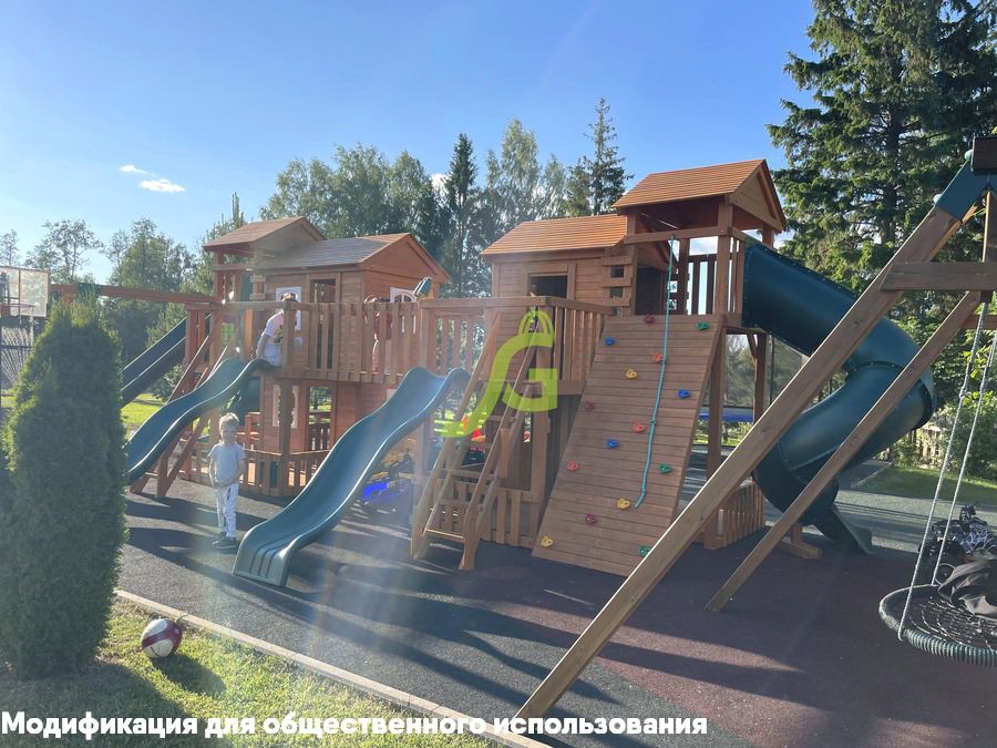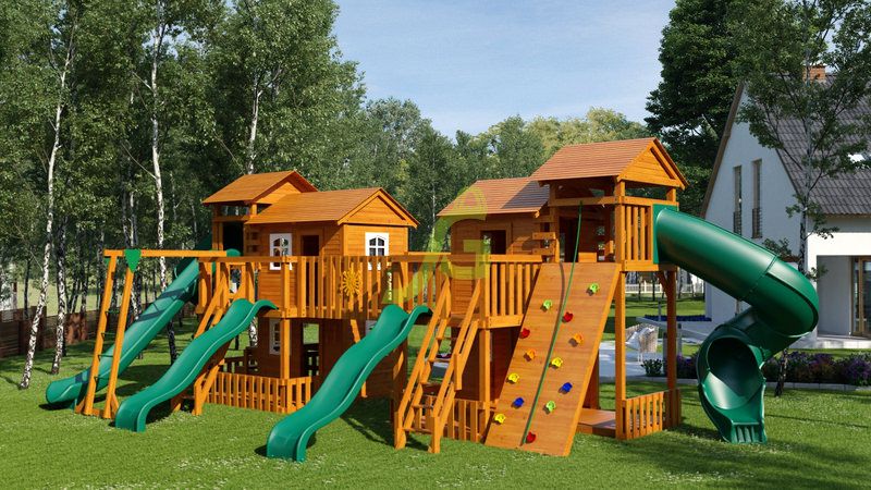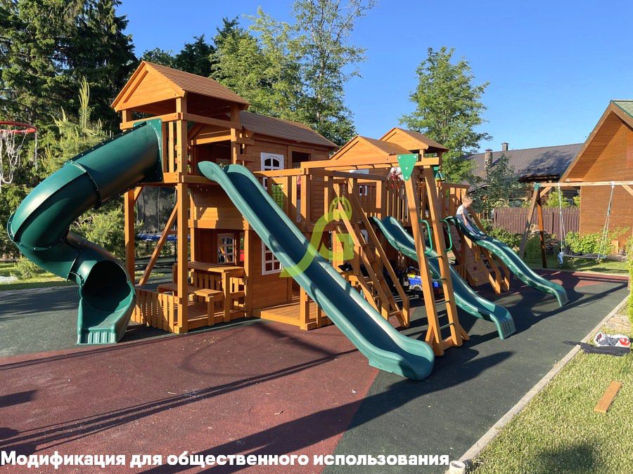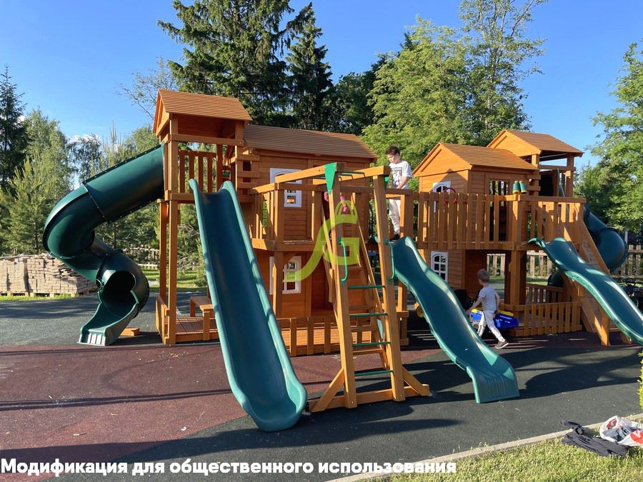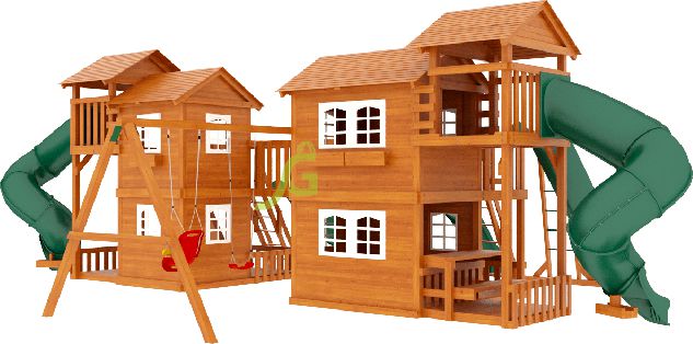 Грандиозный деревянный комплекс укомплектован несколькими домиками, соединенными между собой переходами-мостиками. Это двухуровневые башни с домиками и верандами, с пластиковыми окошками, тремя горками – волновыми разной длины и горками в виде трубы.