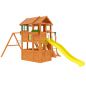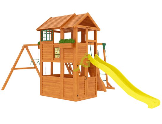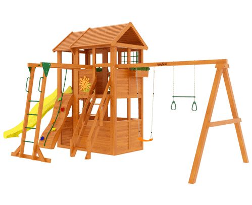Детская площадка для дачи – это еще одна из новых моделей 2018 года, не имеющая аналогов. Замечательный вариант детской площадки для небольших участков, при этом в комплекс игровой зоны также входят закрытый двухуровневый домик с дверью, крытый деревянной крышей. Трехметровая волновая горка – наиболее любимый детьми снаряд на площадке для игр. Деревянная лестница, скалодром, канат – занимательные элементы для любителей покорять высоты. Трапеция с кольцами и качели, а также доска для игры в "Крестики-нолики" - дополнительные нужные предметы, которые весьма заинтересуют юных спортсменов, космонавтов, шахматистов.