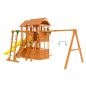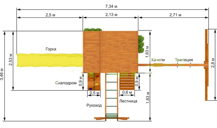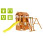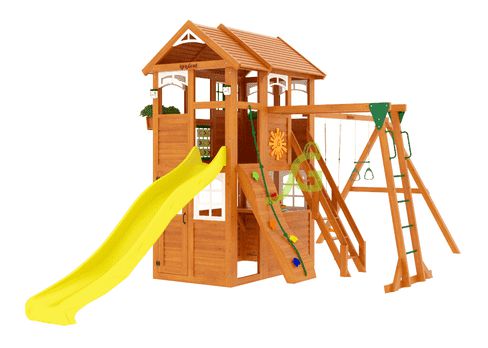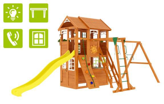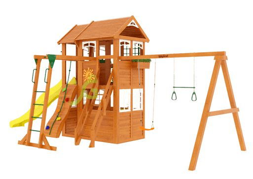 Детская площадка для дачи – это еще одна из новых моделей 2018 года, не имеющая аналогов. Замечательный вариант детской площадки для небольших участков, при этом в комплекс игровой зоны также входят закрытый двухуровневый домик с дверью, крытый деревянной крышей. Трехметровая волновая горка – наиболее любимый детьми снаряд на площадке для игр. Деревянная лестница, скалодром, канат – занимательные элементы для любителей покорять высоты. Трапеция с кольцами и качели, а также доска для игры в "Крестики-нолики" - дополнительные нужные предметы, которые весьма заинтересуют юных спортсменов, космонавтов, шахматистов.