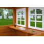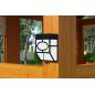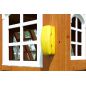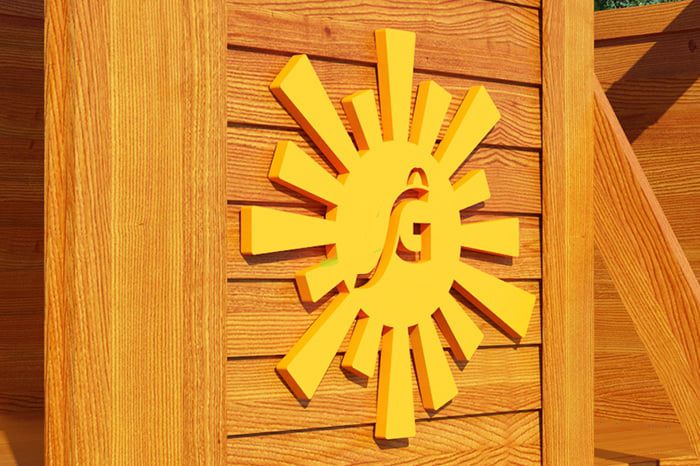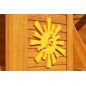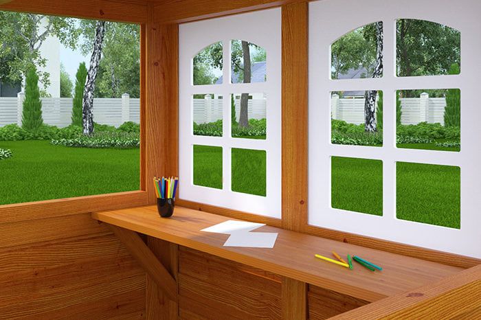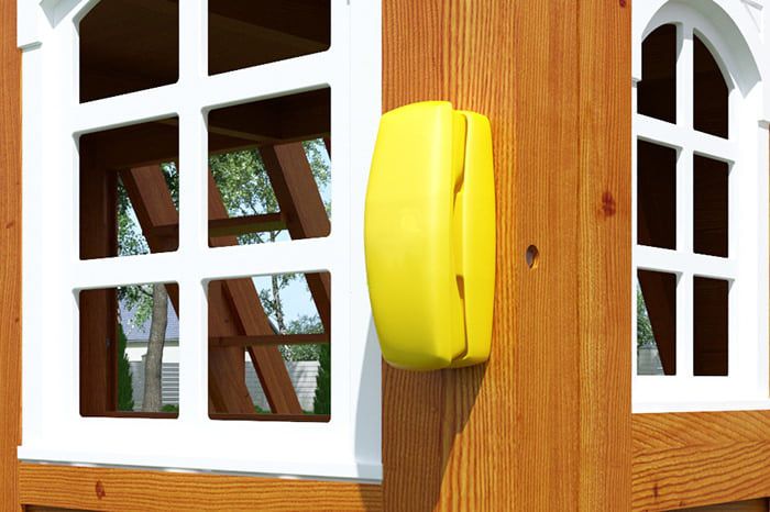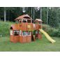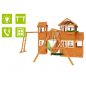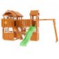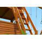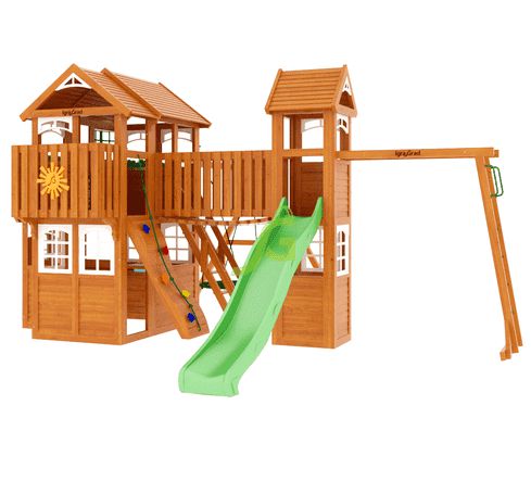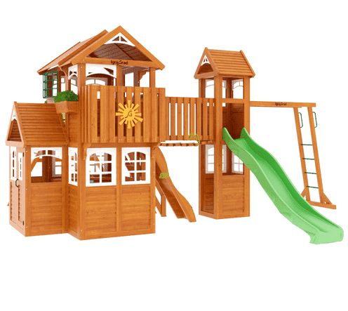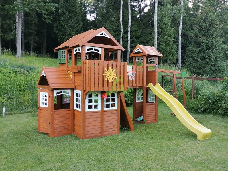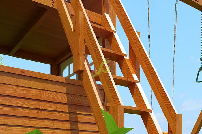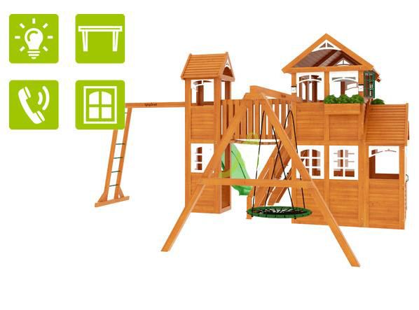 Комплексное сооружение детской площадки представляет собой двухуровневый деревянный домик с увеличенным первым этажом, дополненный двускатной крышей и балконом. Чтобы ребенок мог вдоволь насладиться покорением высоты, детская площадка снабжена деревянной лестницей, подвесным мостом, скалодромом, а также канатом. Удобные качели-гнездо, диаметром 100 см, позволяют прокатить более одного ребенка или насладиться качением лежа.