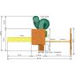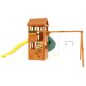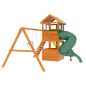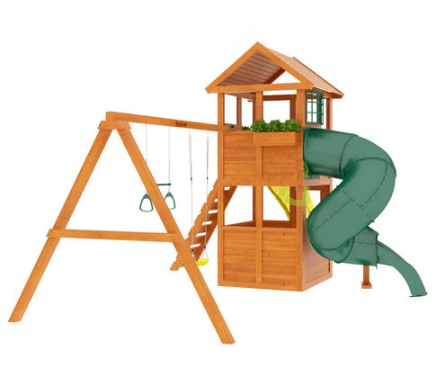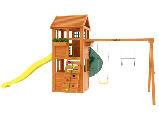 Детская площадка для дачи – разработка опытных инженеров компании. В комплекс входят закрытый двухуровневый деревянный домик, оснащенный дверью, крышей, пластиковым окошком. Трехметровая волновая горка и горка-труба с высоты 1.5 метров – излюбленный предмет на игровой зоне. Чтобы детки могли не просто интересно провести время на улице, но и с пользой для здоровья, конструкторы включили в конструкцию канат, деревянную лестницу-скалодром, трапецию с кольцами. У доски с игрой в "Крестики-нолики" ребенок может делать перерывы между активными тренировками и забегами.