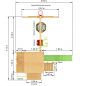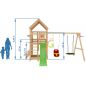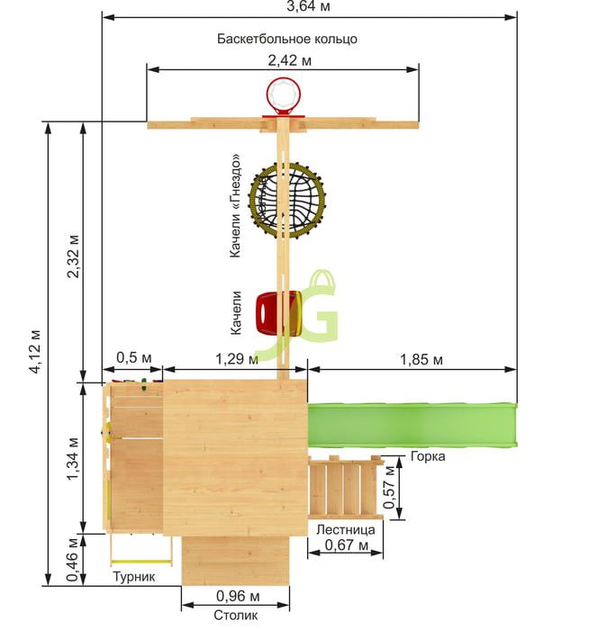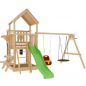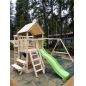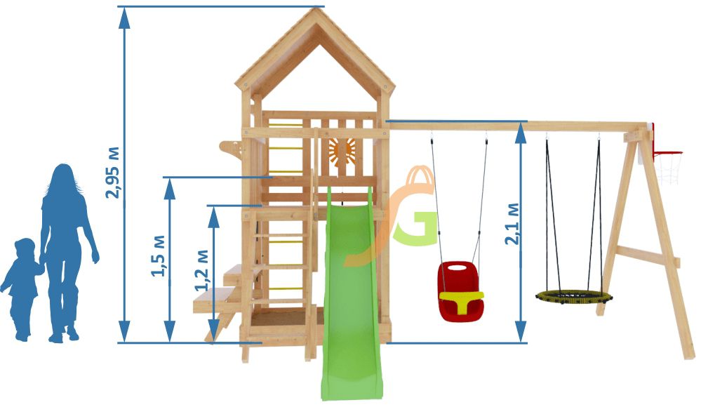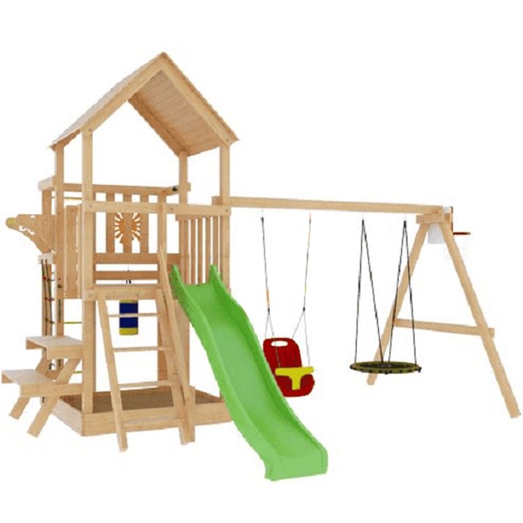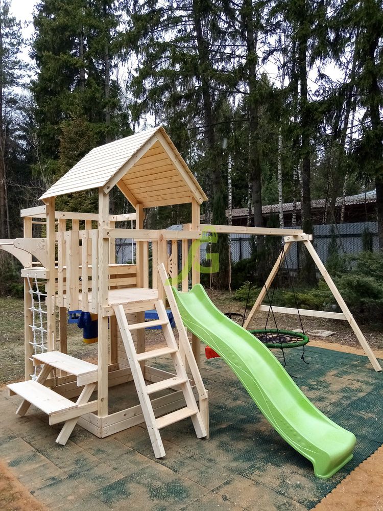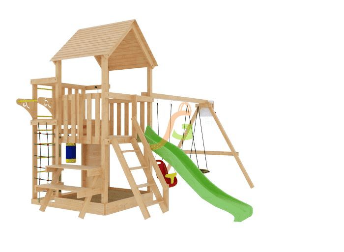 Деревянная несущая конструкция имеет высоту 2,95 м, ширину, длину – 4,12 м. Она представлена в виде двухуровневой башни с крышей. Её дополнением является качельный модуль с пластиковой кубельковой качелью для маленьких детишек и круглой качелью с сеткой для детей постарше. Лесенка, волновая горка находятся на удобной безопасной высоте.