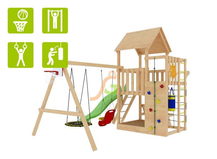 Комплектация конструкции направлена на укрепление суставов, связок, формирования правильной осанки, мышечного корсета. Поэтому она состоит из турника, верёвочной и деревянной лестницы, скалодрома и баскетбольной сетки.