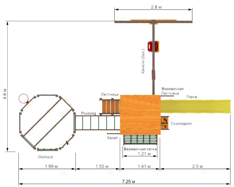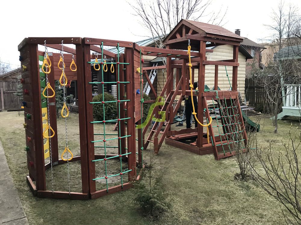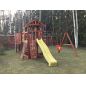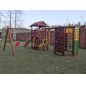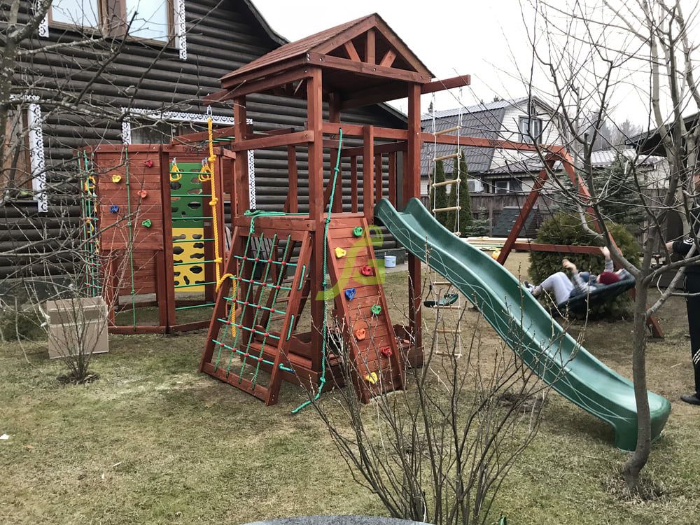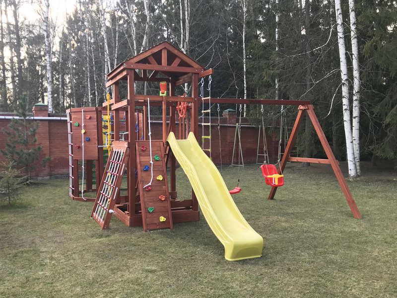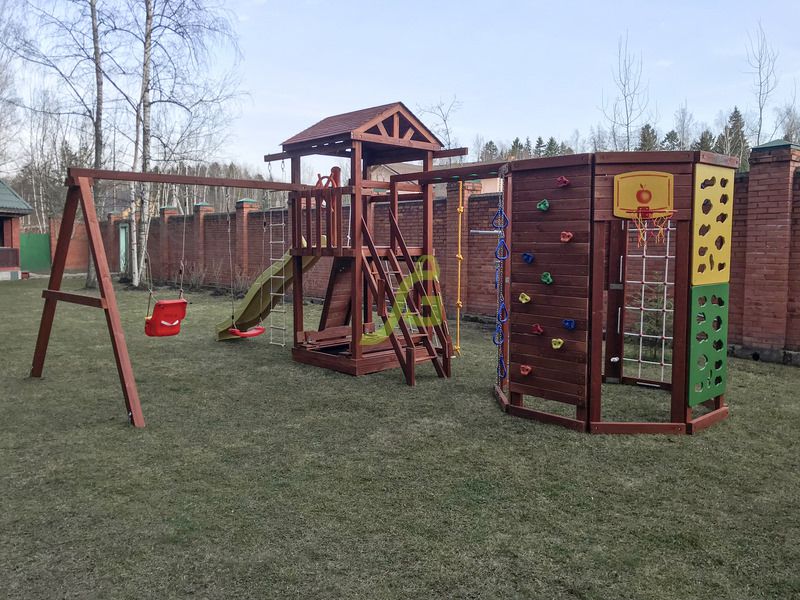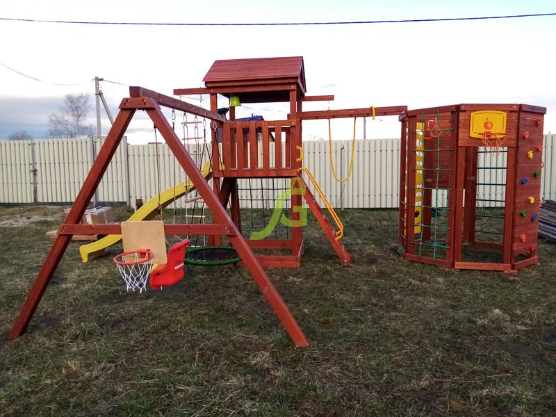 Вашему вниманию представлена двухуровневая башня с крышей. Ради функциональности сооружение дополняется качельным модулем и шведской стенкой в виде многогранника. Благодаря наличию разнообразных спортивно-игровых снарядов (волновая горка, скалодром, рукоход, верёвочные лестницы и т.д.), детская площадка мотивирует ребят двигаться, проявлять активность. Им хочется преодолеть все препятствия, поиграть со всеми снарядами. Умеренные физические нагрузки в тандеме со свежим воздухом – настоящая витаминка для ребёнка!