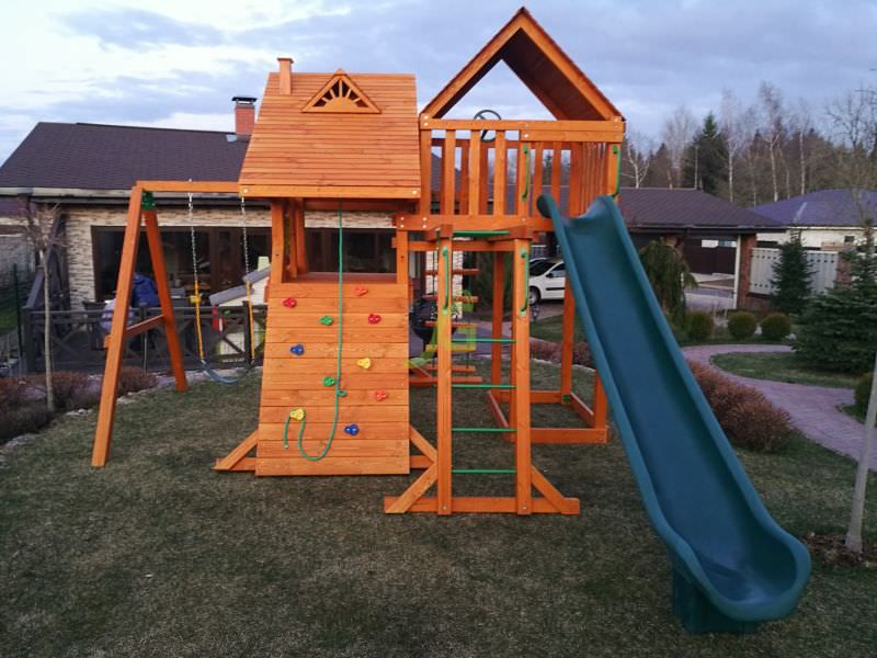 Маленькие шалуны могут не только покачаться на качельках, покататься с усиленной горки, но и вообразить себя альпинистом, взбираясь по скалодрому. Можно побывать в роли моряка, находясь в воображаемой рубке (дополнительном домике), отдавая команды и рассматривая в бинокль айсберги. Для удобного подъёма предусмотрена деревянная лестница. Пообщаться друг с другом и поиграть в настольные игры можно за маленьким столиком.