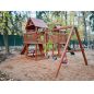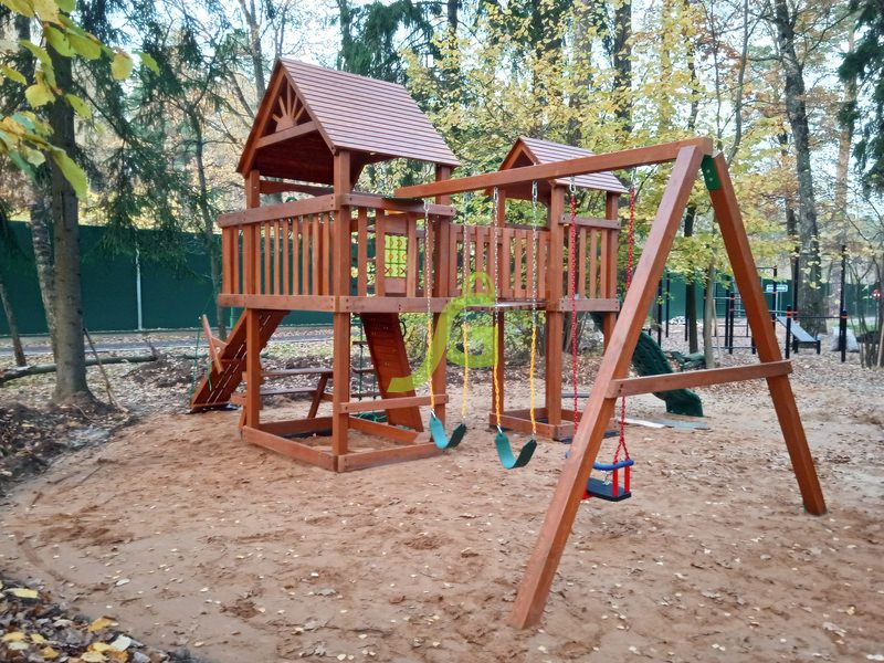 Детская площадка для дачи - уникальная конструкция, которая предоставляет детям широкие возможности для организации весёлых игр. Двухуровневый домик укомплектован качельным модулем, трапецией с кольцами, верёвочной лестницей, скалолазной стеной с канатом, деревянной лестницей. С помощью перечисленных спортивных атрибутов дети с пользой для здоровья проведут свой досуг.