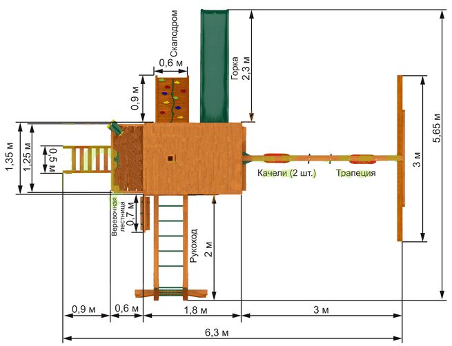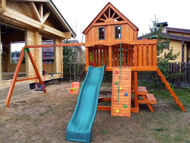 Двухуровневый домик с имитированной мансардой, трубой, большими окнами прекрасно смотрится напротив дачного домика или коттеджа. Взобраться на второй уровень можно по деревянной или верёвочной лестнице.