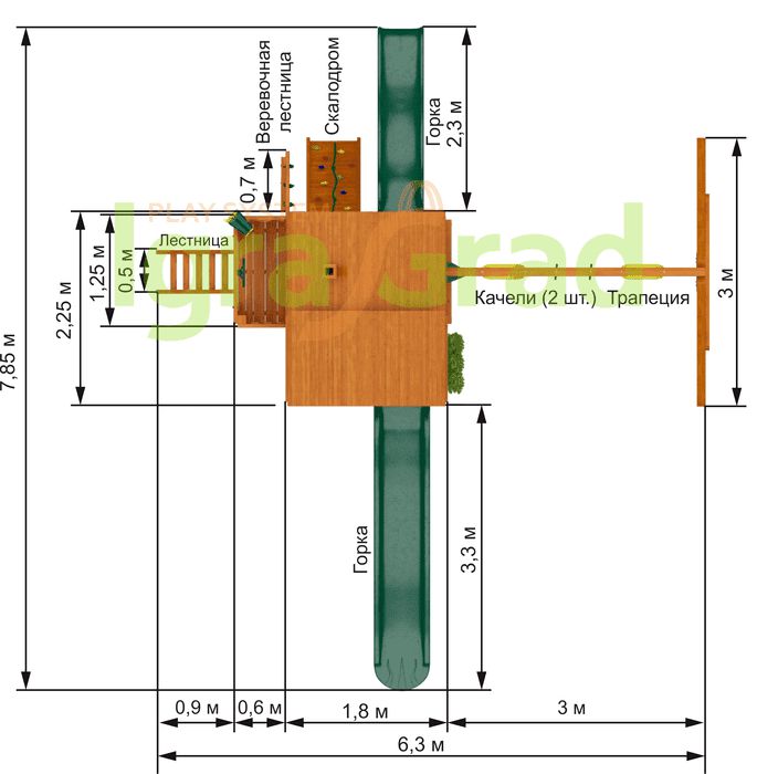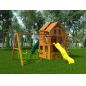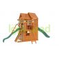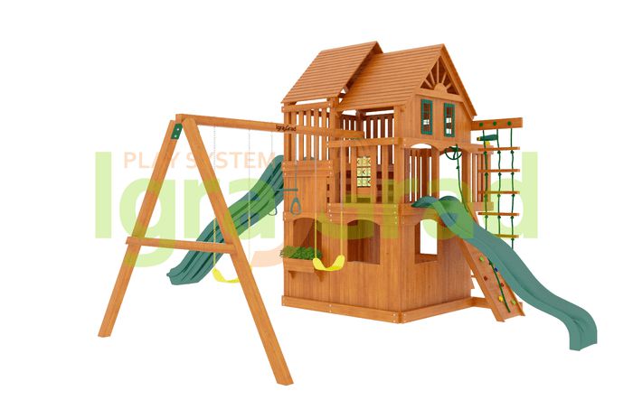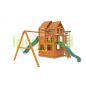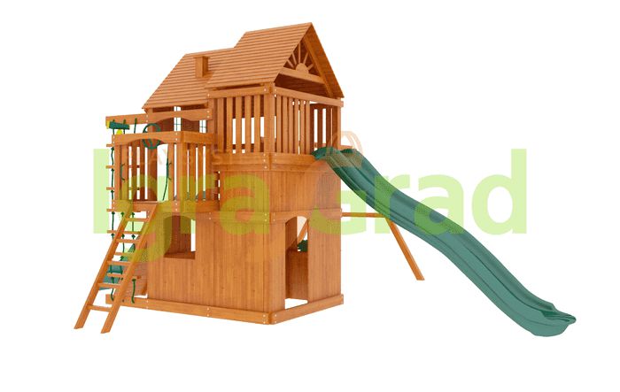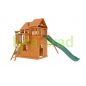 Двухуровневый домик с дополнительной башней зашит снизу, поэтому дети, играя в песочнице или сидя за столиком, будут защищены от солнца, ветра, внезапного дождя. Для весёлого спуска имеется две волнообразных горки, одна для малышей, а другая для детей постарше. Стоп! А как на них взобраться? Придётся немного попыхтеть! Можно воспользоваться скалодромом, верёвочной или деревянной лестницей.