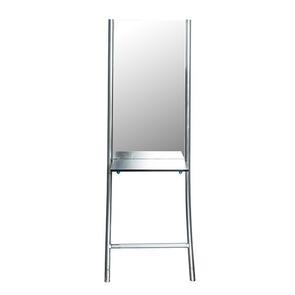 Зеркало имеет металлический каркас серого цвета и столешницу из ламинированного ДСП.