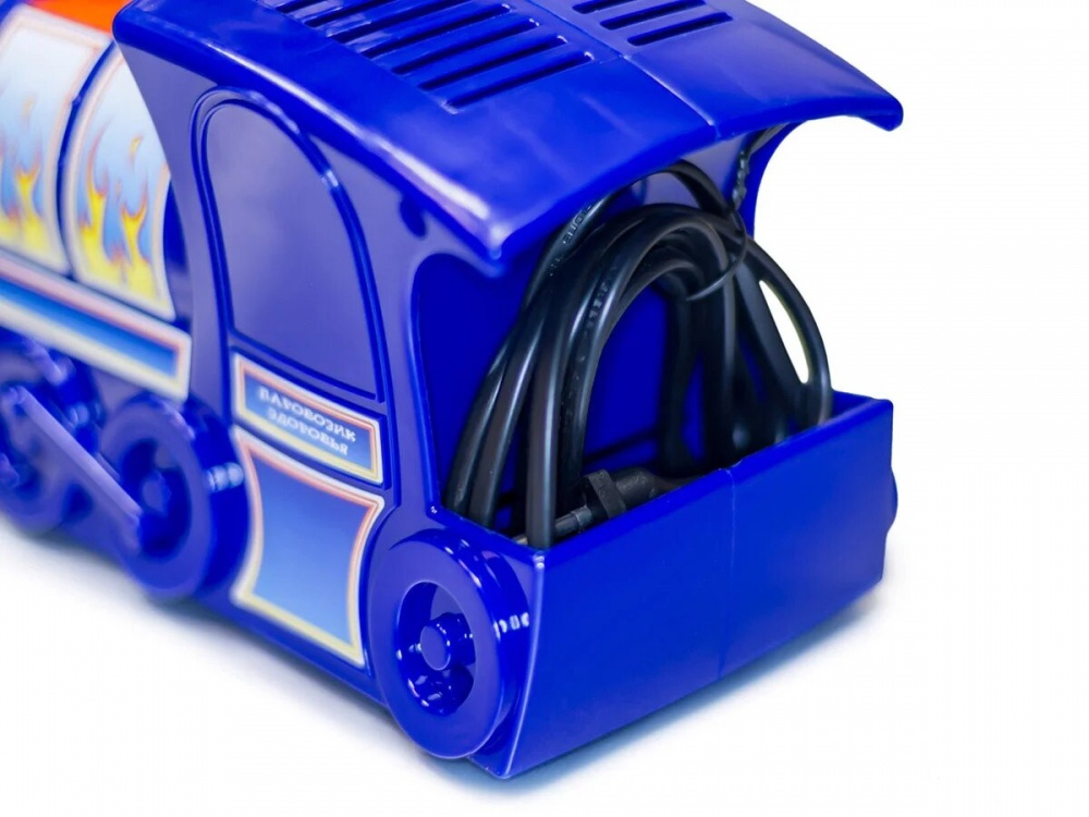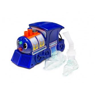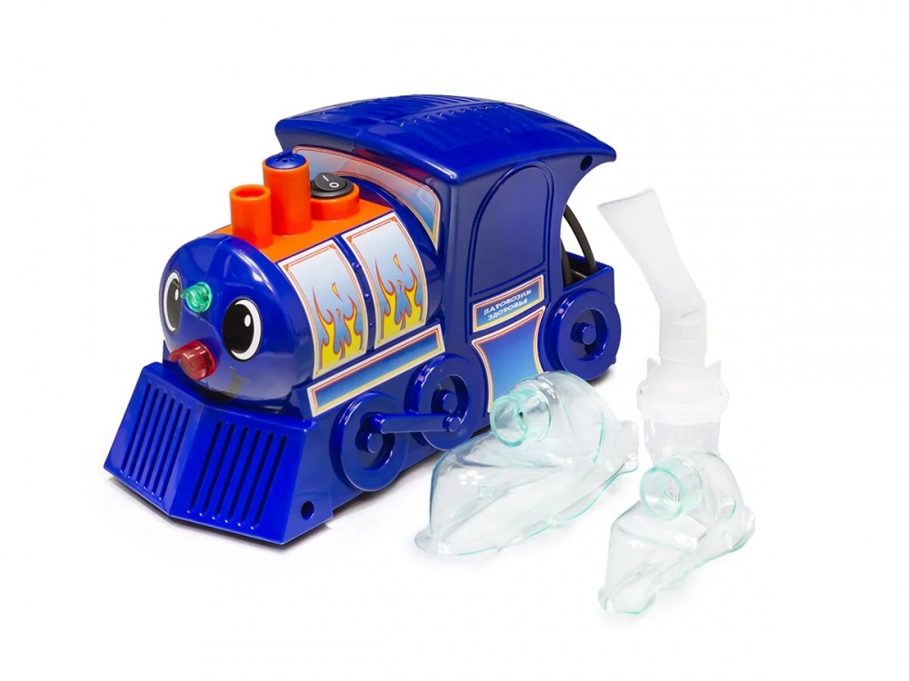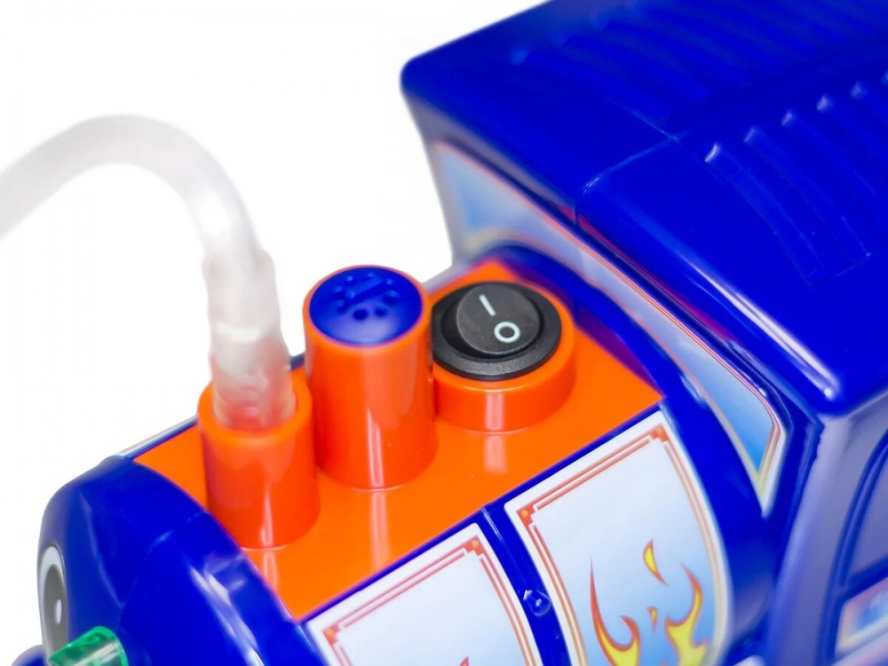 Детский ингалятор стилизован под игрушечный паровозик, что позволяет отвлечь малыша во время проведения процедуры. В корпусе прибора предусмотрен отсек для хранения провода. Управление осуществляется единственной кнопкой, которая запускает устройство. Регулировки скорости подачи раствора лекарства нет.
