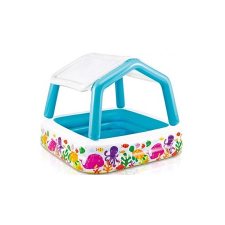 Детский надувной бассейн Sun Shade Intex 57470 - отличный надувной бассейн, который предназначен для купания и веселых игр в воде под открытым небом. Данная модель оборудована специальным съемным навесом, который надежно защищает от воздействия прямых солнечных лучей. Бассейн можно очень легко и быстро надуть и использовать без применения каких-либо специальных средств. Очень удобен, можно брать с собой в дорогу. Изготовлен из прочных и высококачественных материалов, что гарантирует долгий срок службы.