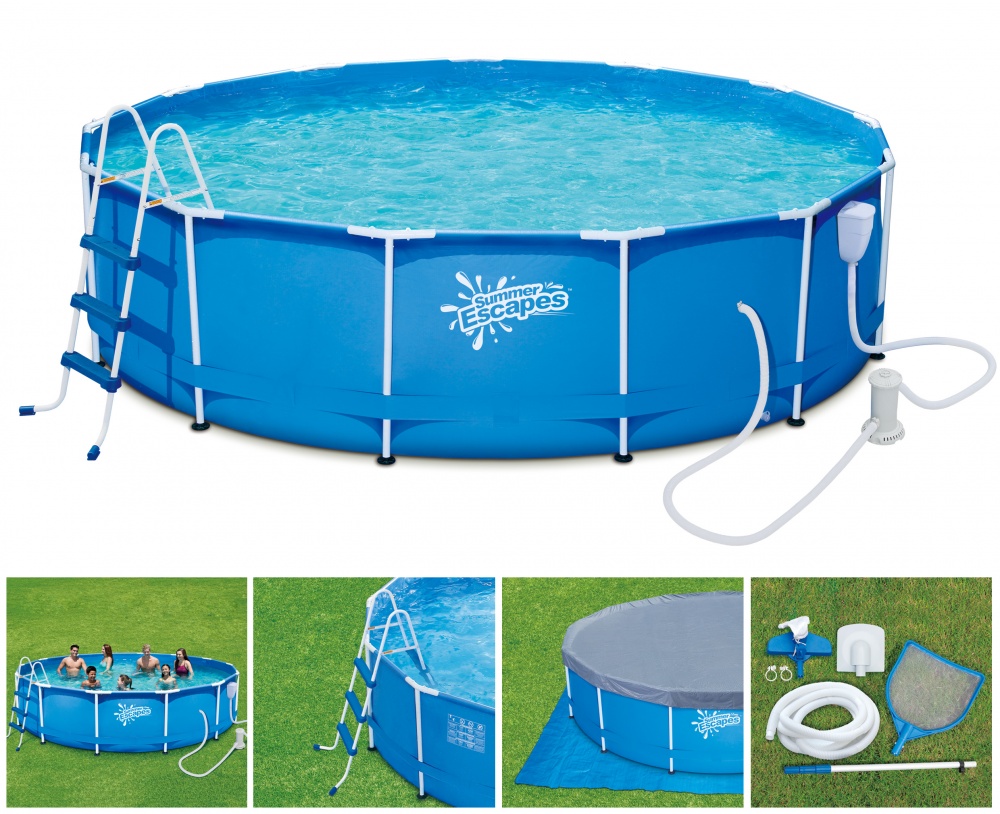 Сборный каркасный бассейн SummerEscapes P20-1452-B в полной комплектации - с картриджным фильтр-насосом, лестницей, тентом, настилом, набором для чистки и скиммером.