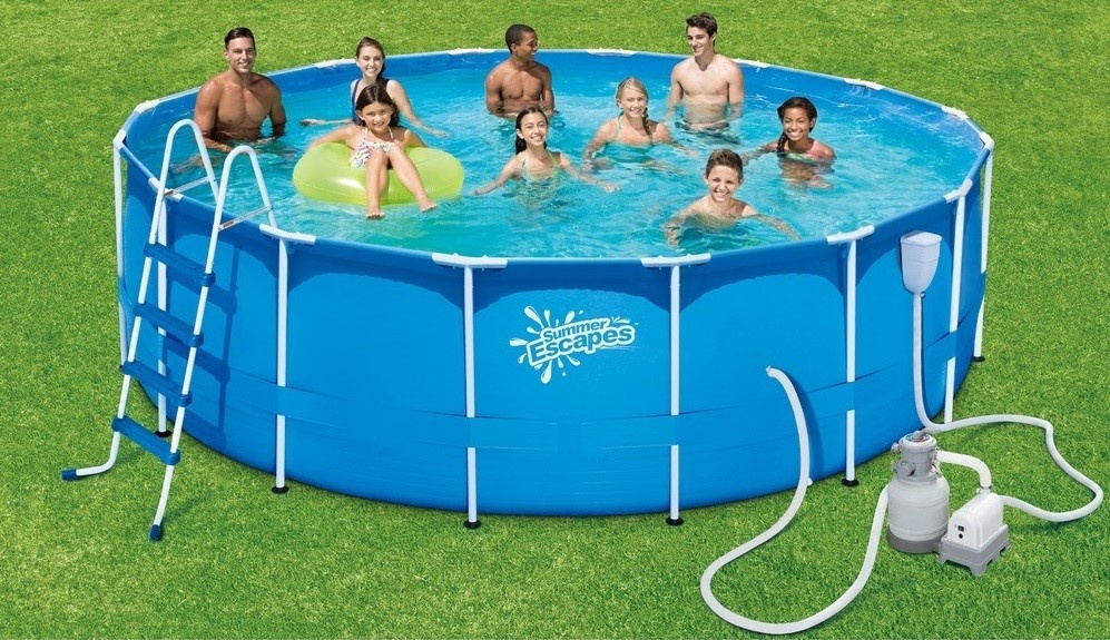 Сборный каркасный бассейн SummerEscapes P20-1452-S в полной комплектации - с песочным фильтр-насосом, лестницей, тентом, настилом, набором для чистки и скиммером.