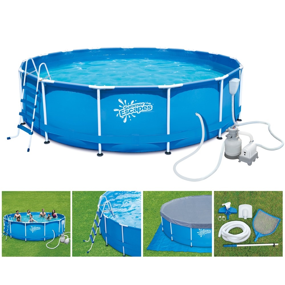 Сборный каркасный бассейн SummerEscapes P20-1548-S в полной комплектации - с песочным фильтр-насосом, лестницей, тентом, настилом, набором для чистки и скиммером.