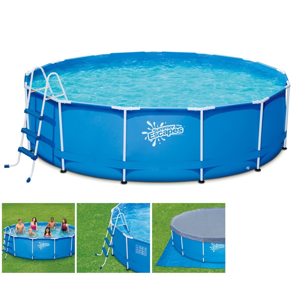 Сборный каркасный бассейн SummerEscapes Р20-1339-Z круглой формы с лестницей, настилом и защитным тентом. Бассейн выполнен из высококачественного трехслойного ПВХ. Стойки каркаса металлические с защитным покрытием. Простота конструкции позволяет легко собирать бассейн за 45 минут.