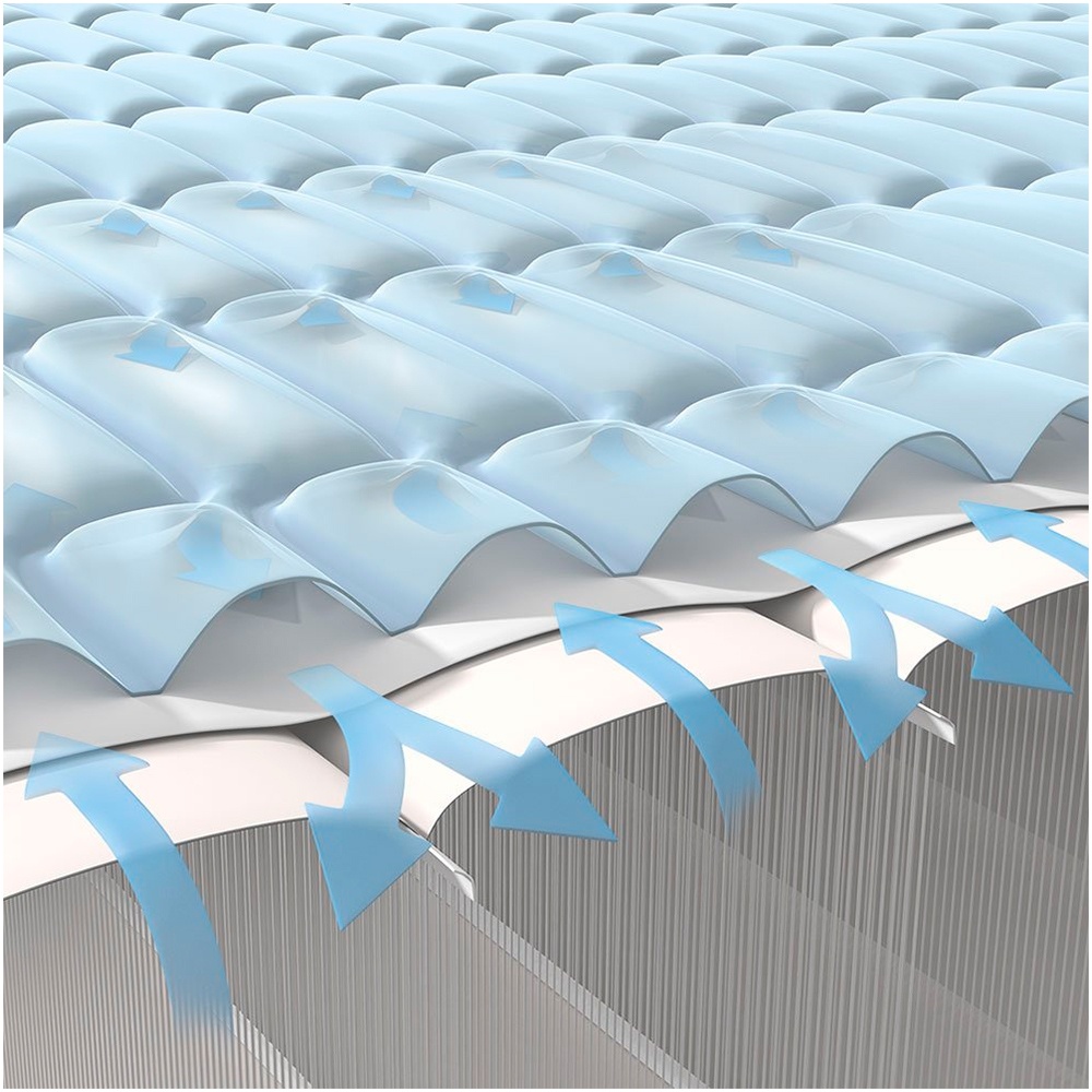 Низ и бока кровати имеют дополнительный защитный слой (похожий на ткань), предохраняющий кровать от механических повреждений. Верхний слой кровати так же имеет дополнительный слой, состоящий из множества воздушных карманов , что обеспечивает невероятный комфорт для отдыха и сна.
