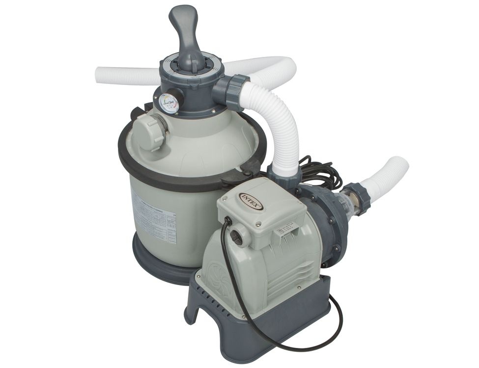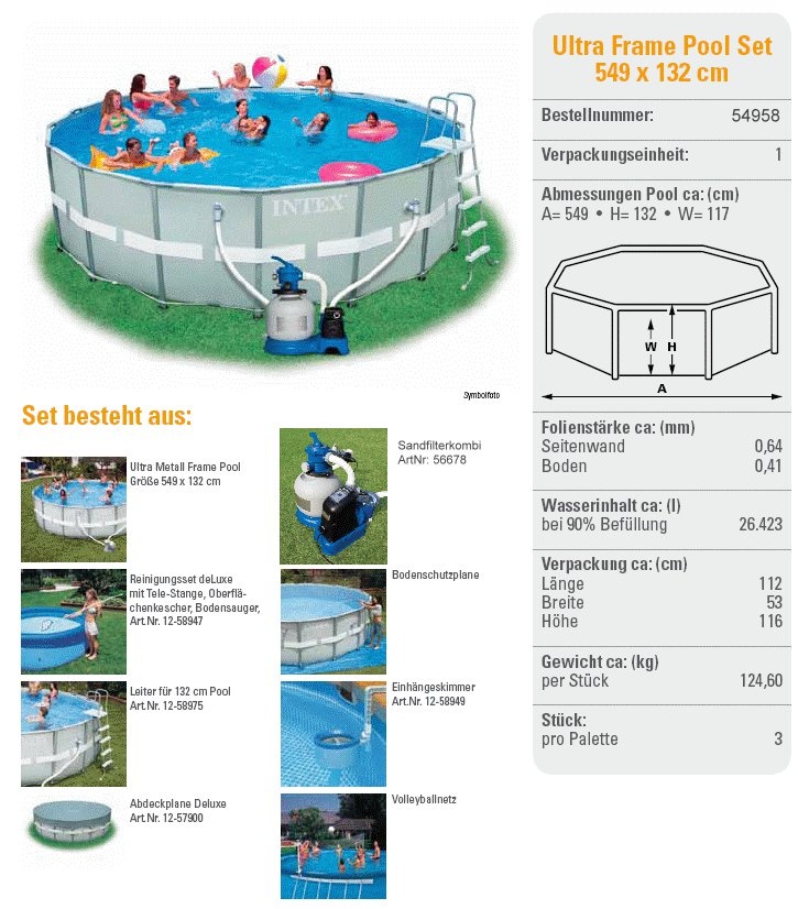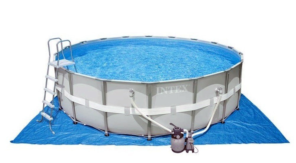 Сборный каркасный бассейн серии Intex Ultra Frame комплектации FULL с комбинированным фильтр-насосом, лестницей, тентом и подстилкой, набором для чистки и волейбольной сеткой.
