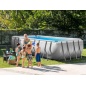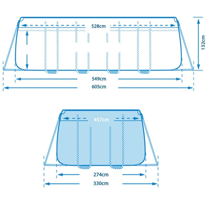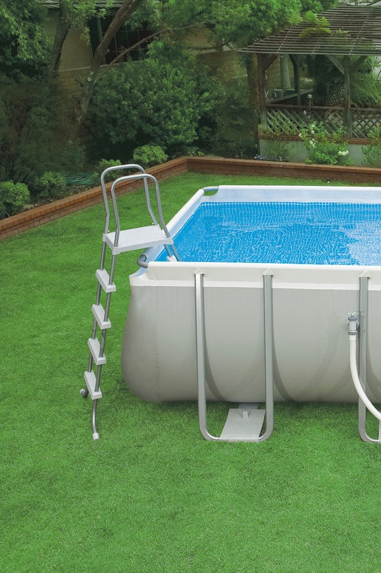 Сборный каркасный бассейн прямоугольной формы серии Intex Ultra Frame комплектации DELUXE с песочным фильтр-насосом, лестницей, тентом и подстилкой.