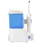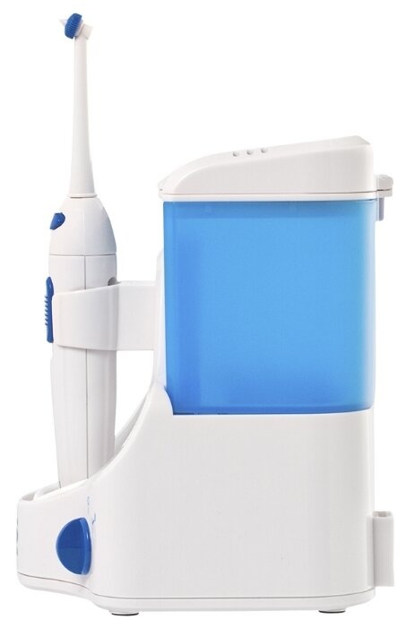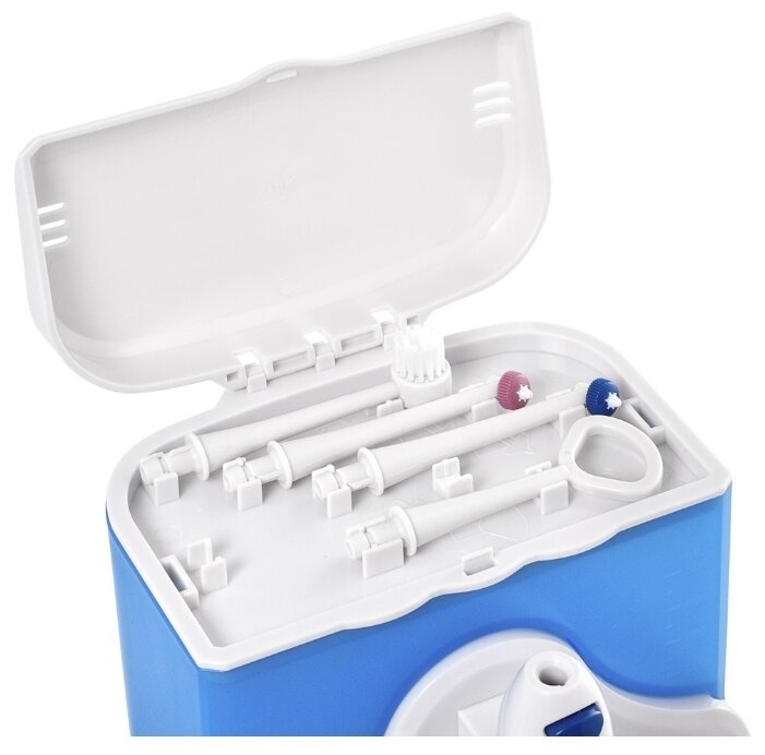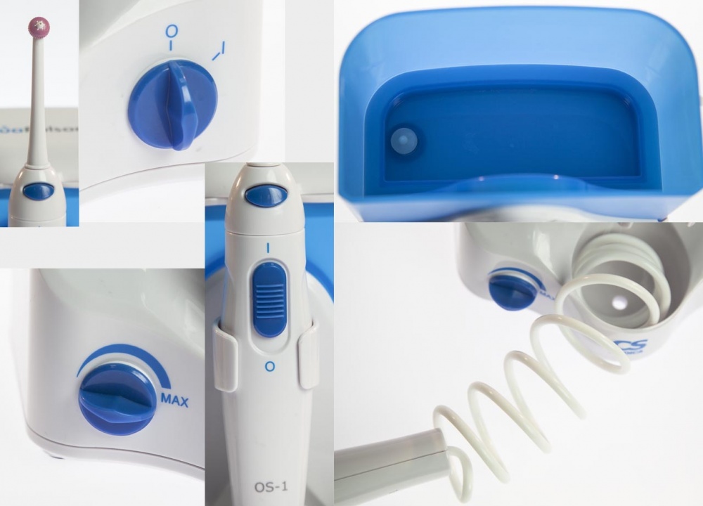 Регулировка происходит вручную, при помощи поворотного колесика. В набор входят несколько насадок: для щек и языка, для искусственных элементов (импланты, брекеты, мосты) и универсальная, очищающая зубы и десна.