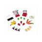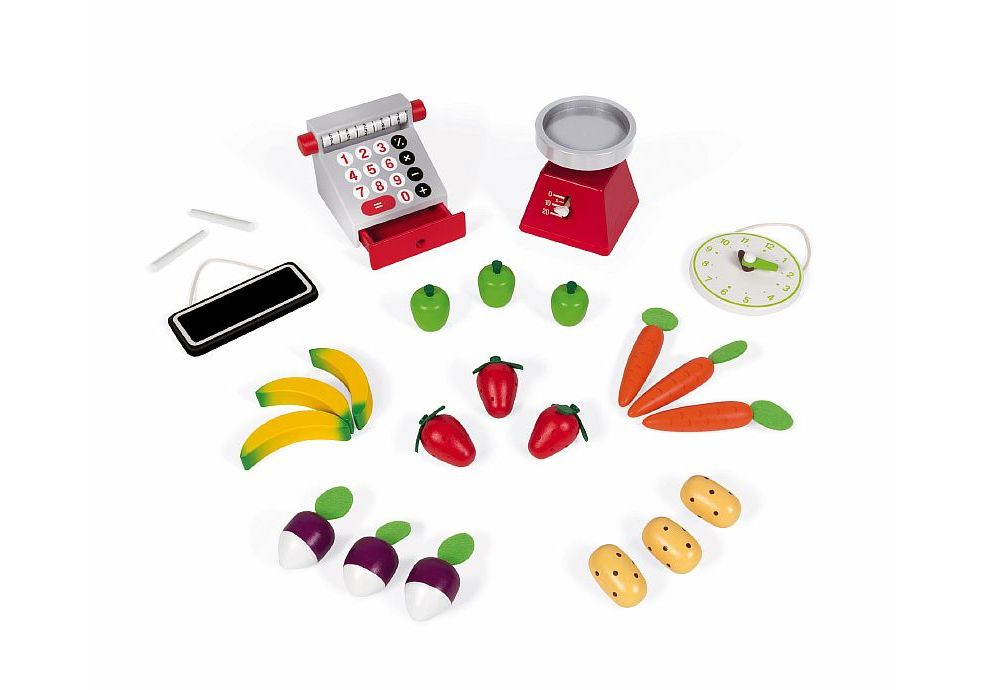 Игровой набор Мини-магазин позволит ребёнку побыть в роли продавца или покупателя. Здесь можно купить самые свежие овощи и фрукты. В комплекте часы, доска для надписей, коробка с мелом, 6 коробок имитирующих еду, 1 кассовый аппарат, 1 весы, 18 фруктов и овощей, 1 набор банкнот и монет, 3 бумажные хозяйственные сумки.