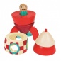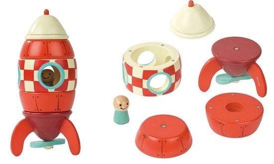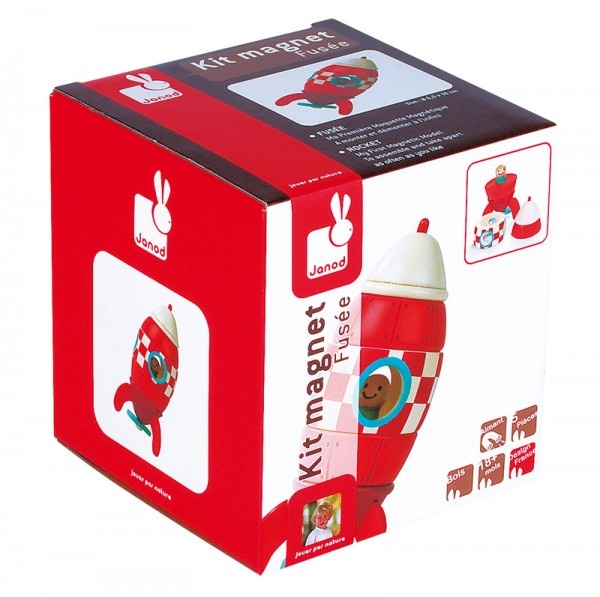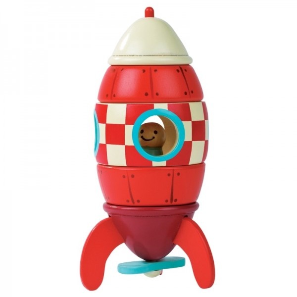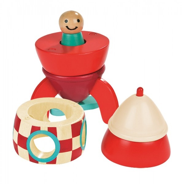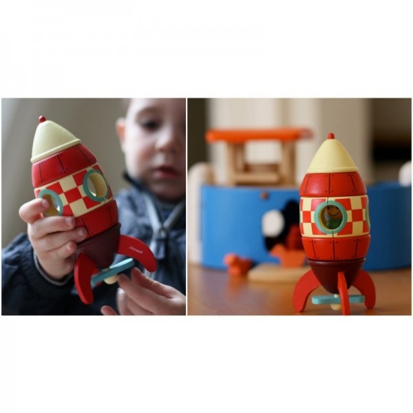 Перед вами яркая и функциональная игрушка, выполненная из дерева. Высота ракеты в сборе 16 см, диаметр 6,5 см. Все части ракеты соединяются друг с другом при помощи магнитов. Основание ракеты фиолетового цвета с тремя красными ножками, которые обеспечивают устойчивость и голубым вращающимся пропеллером. Два элемента, на которые нанесен рисунок, имитирующий обшивку корабля с заклепками. Между ними кабина ракеты с иллюминаторами, обведенными голубым цветом. Кабина, в красно-белую шашечку. Внутри ракеты фигурка космонавта. Верхушка ракеты белого цвета. Производитель, французская компания Janod, позаботился о том, что бы сделать эту игрушку максимально привлекательной и безопасной для детей. Яркие цвета, оригинальный французский дизайн, гладкие, приятные на ощупь поверхности. Набор упакован в подарочную коробку.