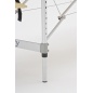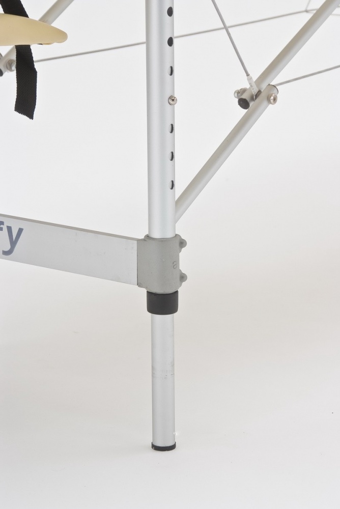 Легко и быстро трансформируется в чемодан. Основа - многослойная легкая фанера. Рама -алюминий. Поверхность - высококачественный винил. Наполнение - плотный пенополиуретан толщиной 5 см. Регулировка по высоте. В комплекте - съемный регулируемый подголовник, подставка для рук.