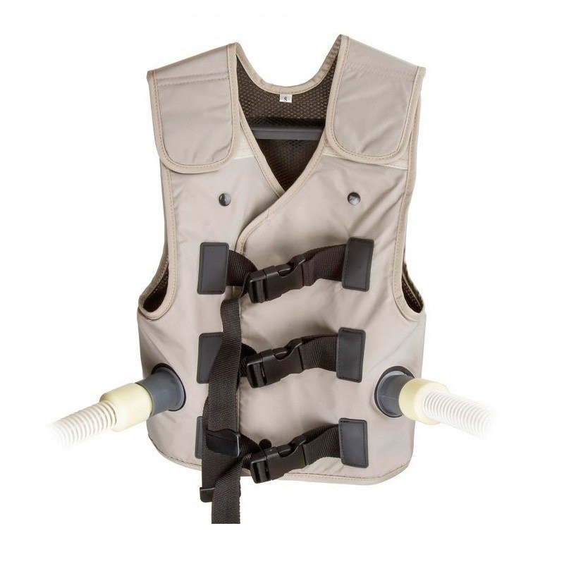 Представляем Вашему вниманию жилет для проведения виброперкуссионной терапии. Жилет оснащен пневмоячейками, внутри которых поочередно создается высокое и отрицательное давление с помощью специального компрессора (в стоимость не входит). Смена давления в полостях жилета происходит очень быстро (до 780 циклов в секунду), в результате чего пациент ощущает вибрацию в области грудной клетки (мягкое ударное пневматическое воздействие, называемое пневмоперкуссией).