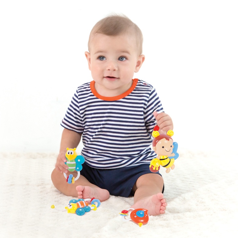 Когда малыш только появляется на свет, то его внимание сначала привлекают яркие объекты, потом он начинает реагировать на звуки и трогает предметы вокруг себя на ощупь. В этом мобиле объединено все, что может заинтересовать любого кроху, и к тому же изделие дополнено съемными погремушками, с которыми можно играть отдельно.