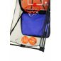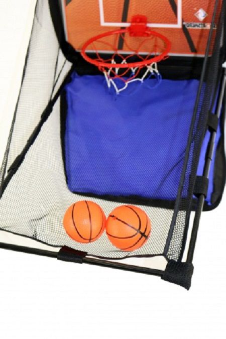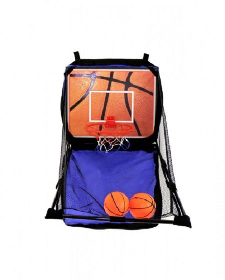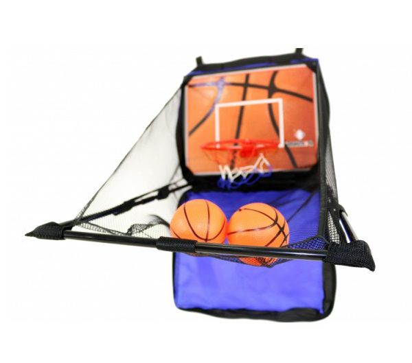 Баскетобольный комплекс легко повесить на стену или дверь с помощью специальной системы креплений, которая позволяет ему оставаться неподвижным во время матча. В комплект входит баскетбольный щит с одним кольцом, защитной сеткой, два детских мяча и насос.