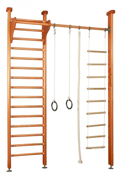 Достоинства: наличие не только классической шведской стенки, но и комплекта из колец, веревочной лестницы и каната