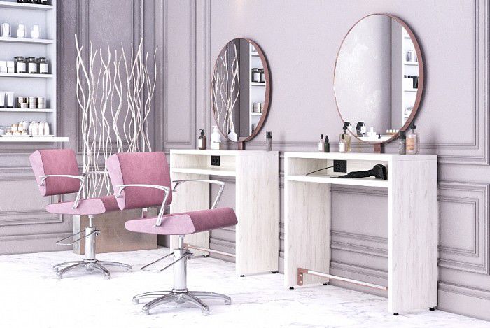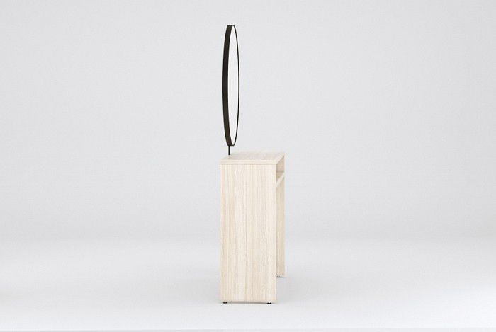 Зеркальное полотно в форме идеального круга, надёжный устойчивый столик из ЛДСП толщиной 32 мм, вместительные столешница и полка для инструментов, мощная металлическая подножка с накладкой из нержавеющей стали, регулируемые опоры и возможность оборудовать скрытые розетки для электроинструмента.
