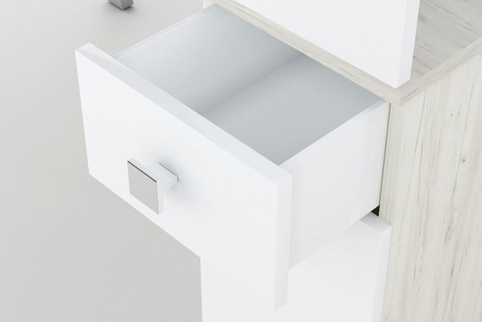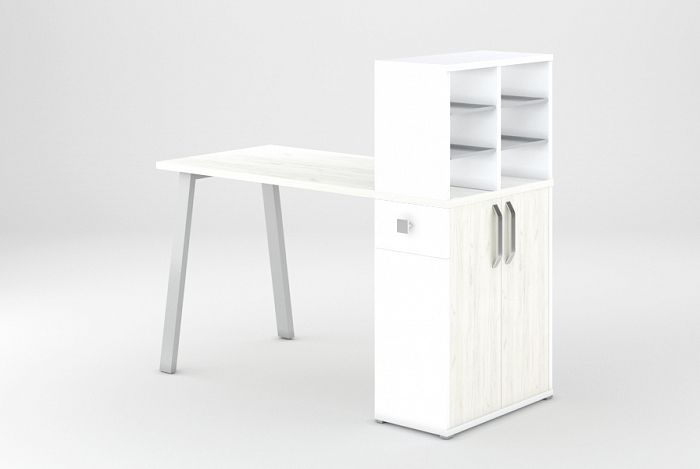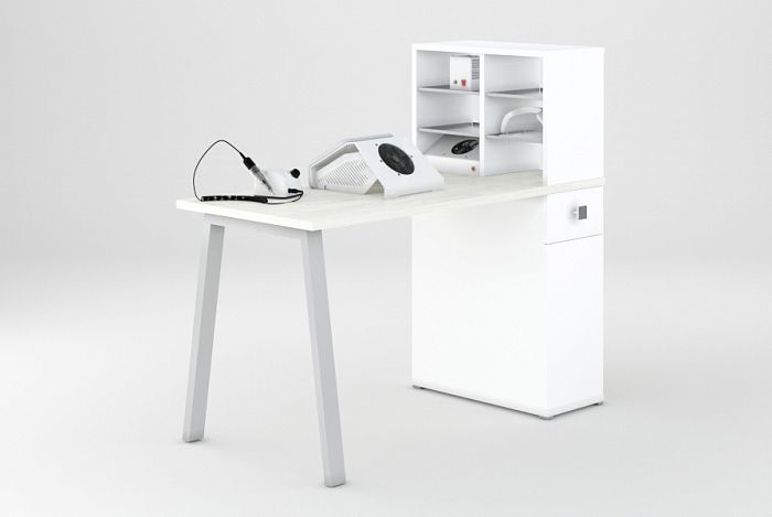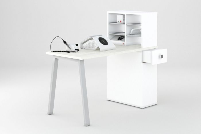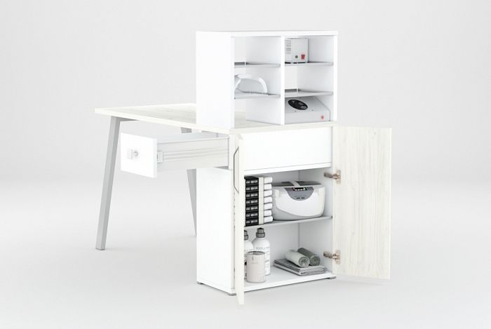 Стильный и комфортный маникюрный стол Formix с уникальной конструкцией, которая включает в себя распашной шкаф для хранения, совмещённый с вместительной настольной подставкой и глубоким выдвижным ящиком для быстрого доступа к самому необходимому. Модель представляет собой полностью завершенное рабочее место. Оснащение стола Formix включает в себя выдвижной ящик глубиной 50 см (!), оснащённый металлическими бортами, надёжные полки из стали толщиной 3 мм (специальные бортики полок препятствуют падению аксессуаров). Полки легко снимаются и дезинфицируются. Оригинальное крепление столешницы придаёт ей визуальную «парящую» лёгкость. Ручки, полки и опора выполнены в благородном матовом сером цвете. Механизм регулировки высоты опоры компенсирует неровности пола.