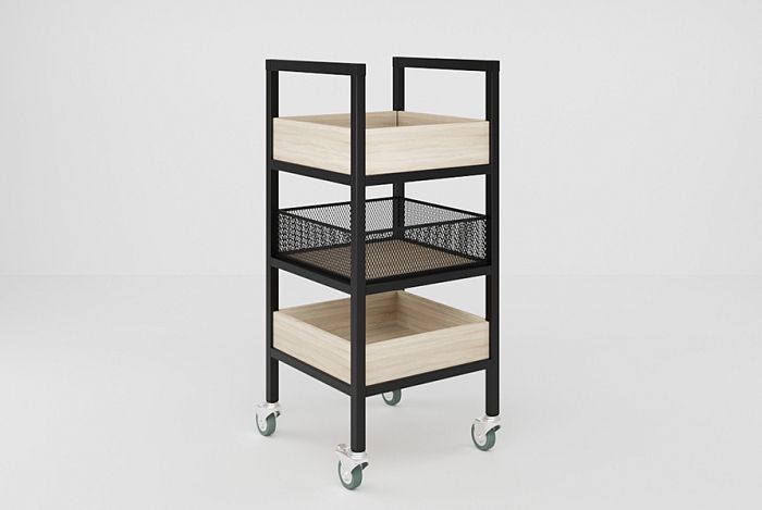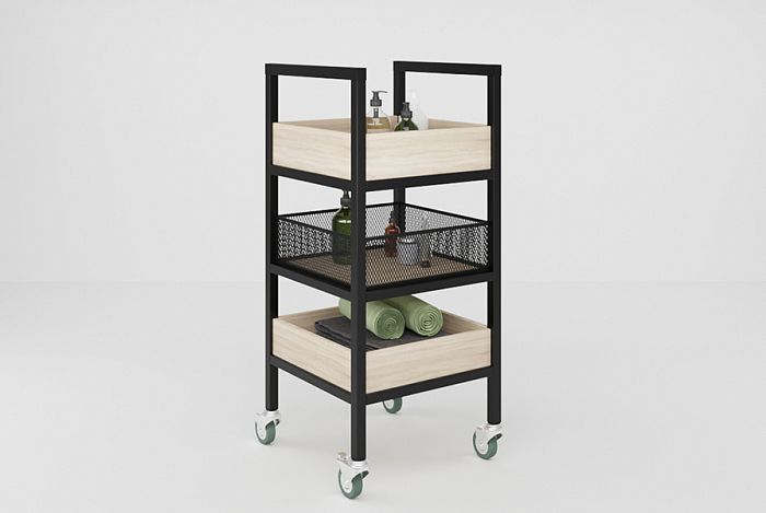 Парикмахерская тележка Ironik Rack 1 изготовлена из качественной высокопрочной стали и влагостойкого ЛДСП. Модель оснащена тремя глубокими ящиками и прорезиненными колесными опорами со стопорами, снижающими уровень шума при передвижении.