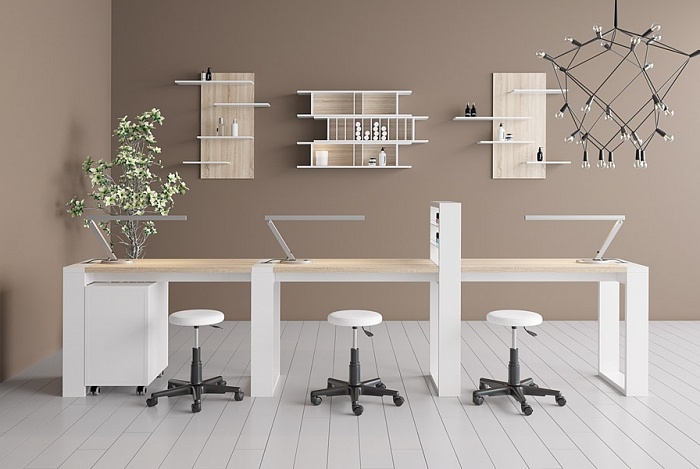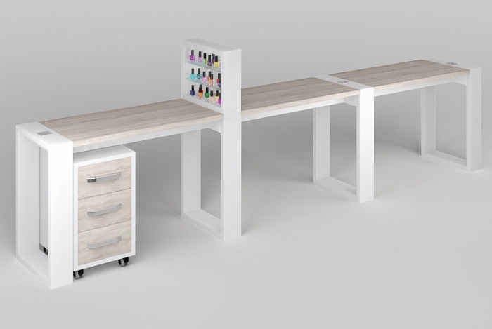 Практичный, компактный и удобный стол Matrix создаётся из секций, которые можно набрать в нужном количестве. Трёхместный маникюрный стол с подставкой для лаков предназначен для одновременной работы трёх мастеров. В столешнице предусмотрены специальные отверстия для маскировки проводов, а мобильная тумба на колёсах оснащена тремя ящиками.