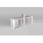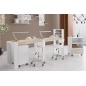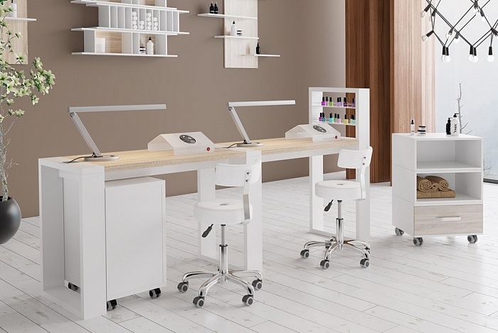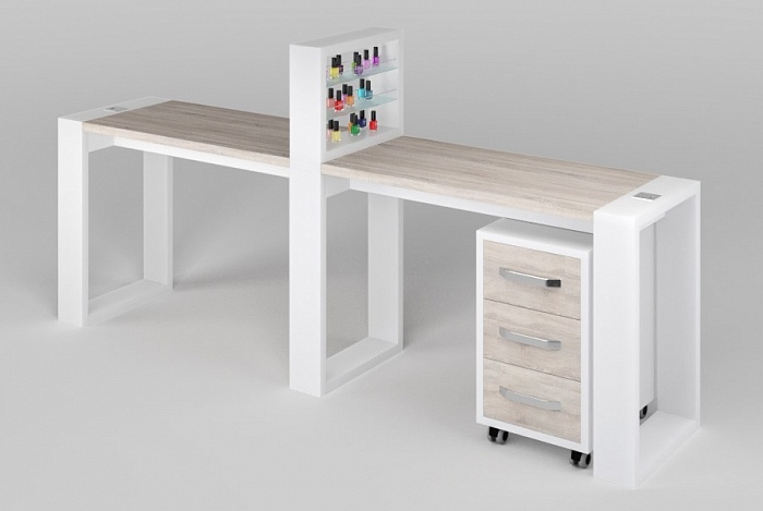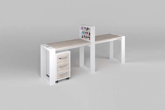 Двухместный маникюрный стол Matrix оснащён подставкой для лаков и предназначен для одновременной работы двух мастеров. Столешница оснащена специальными отверстиями для маскировки проводов. В комплект входит мобильная тумба на колёсах с тремя ящиками.