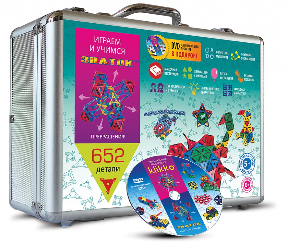 Топовая версия конструкторов Klikko. Обратите внимание на перечень деталей этого набора – здесь присутствуют уже все возможные детали, в отличие от наборов «192 детали», «252 детали» и «452 детали», где некоторые элементы отсутствуют. Но, несмотря на это, и их может не хватить для построения возможных моделей и конструкций – например, модель крейсера, приведённого в инструкции и показанного на DVD, требует 1852 детали! А мы уверены, что Ваша фантазия на этом не ограничится!