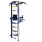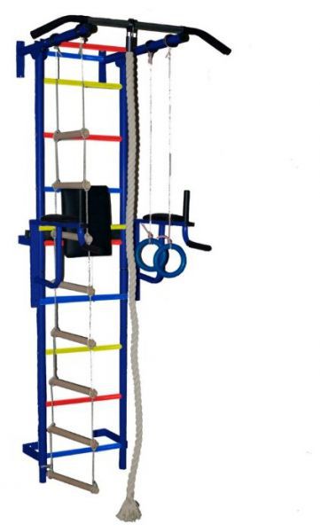 Высота комплекса в собранном виде 2,2 м. Отличительной особенностью комплекса являются съемные брусья для пресса с мягкими элементами спинки и подлокотников и наличие турника. Спортивный комплекс представляет собой сборно-разборную конструкцию из металлических труб, покрытых полимерной порошковой краской, которая устанавливается на пол и крепится к стене.
