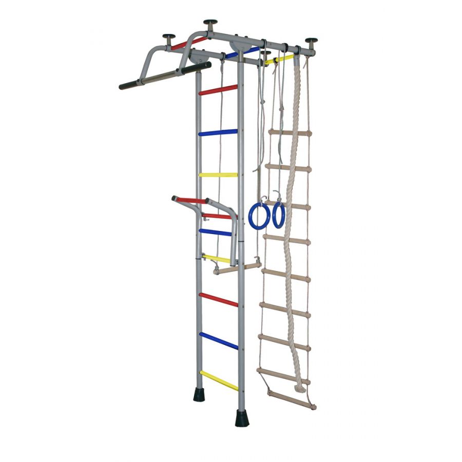 Металлическая шведская стенка Крепыш Т-образный с навесным турником устанавливается в распор между полом и потолком высотой от 2,4 до 2,75 м. Отличительной особенностью комплекса является навесной турник, который можно переставлять по металлической лестнице на любую высоту.