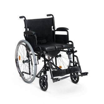 Кресло с санитарным оснащением предназначено для использования людьми с временными трудностями самостоятельного передвижения. Дает возможность осуществить естественные потребности в комфортных условиях. Съемное сидение оснащено судном, которое так же можно извлечь. Подлокотники двойные, ступенчатые, с мягкими накладками. Подножки съемные, поворачивающиеся. Кресло легко сложить без дополнительных инструментов. Передние колеса с цельнолитыми шинами, что обеспечивает высокую проходимость и износостойкость. Задние колеса можно быстро снять с помощью кнопки фиксации. По бокам от кресла располагаются тормозные рычаги.
