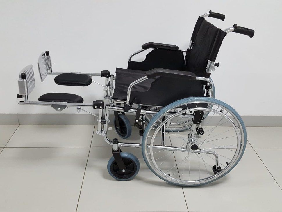 Ступенчатые подлокотники откидываются для обеспечения комфортной посадки человека. Ножные опоры снабжены текстильной лентой для удерживания голени. Колеса цельнолитые, не обслуживаемые.