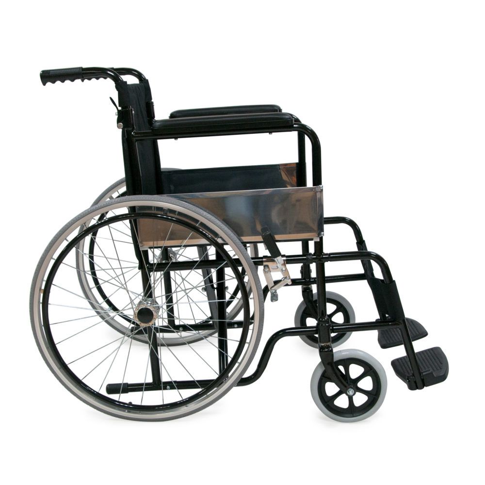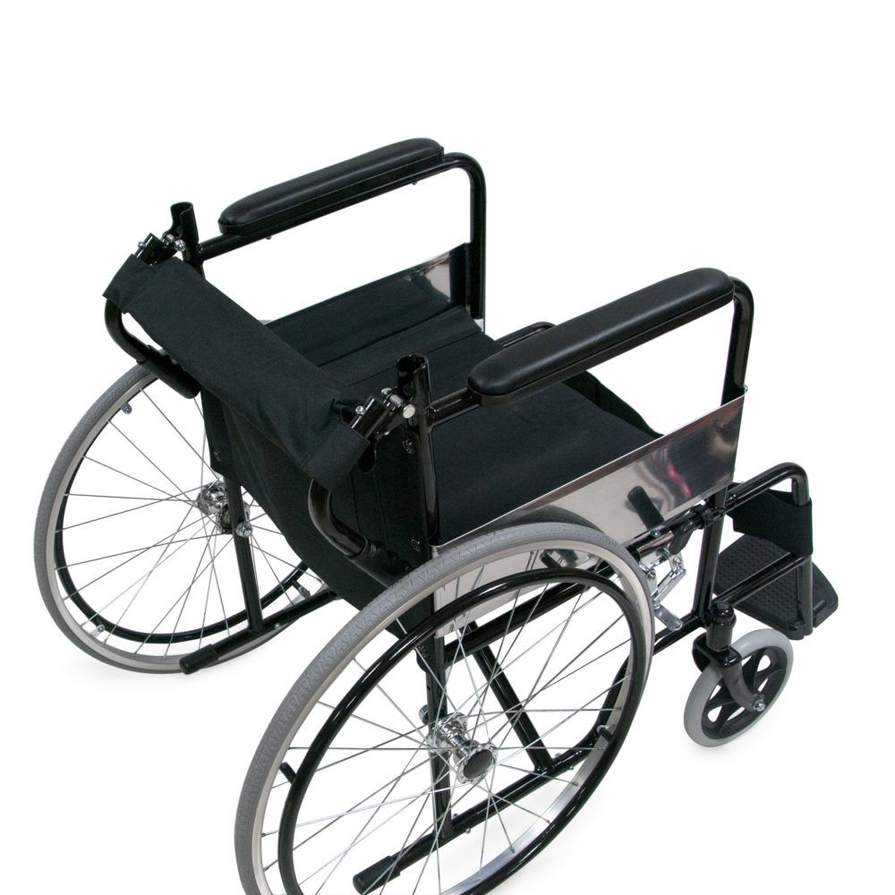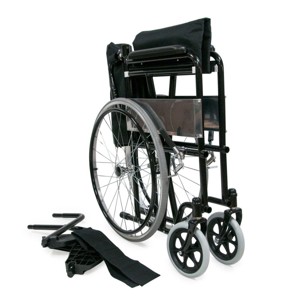 Рама выполнена из стали с полимерным покрытием, не подвергается коррозии, легко складывается и раскладывается без применения инструментов. Подлокотники оборудованы накладками из кожзама, а подножки съемные и регулируются по высоте (3 положений регулировки).