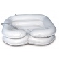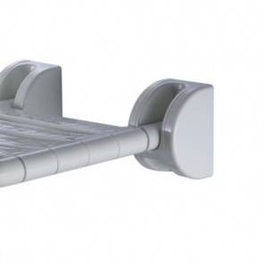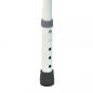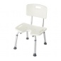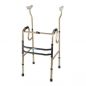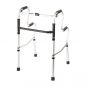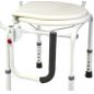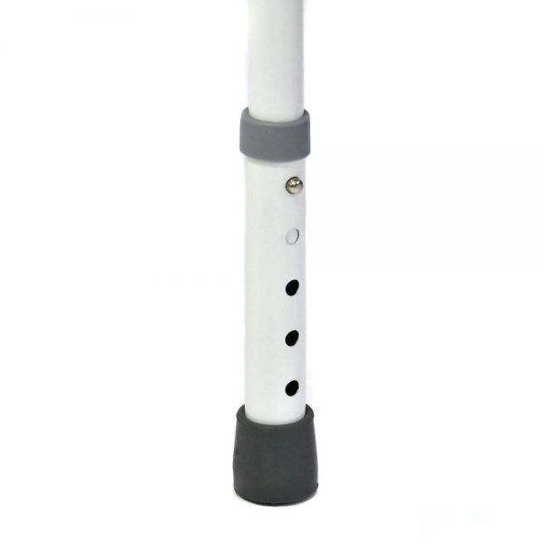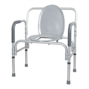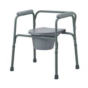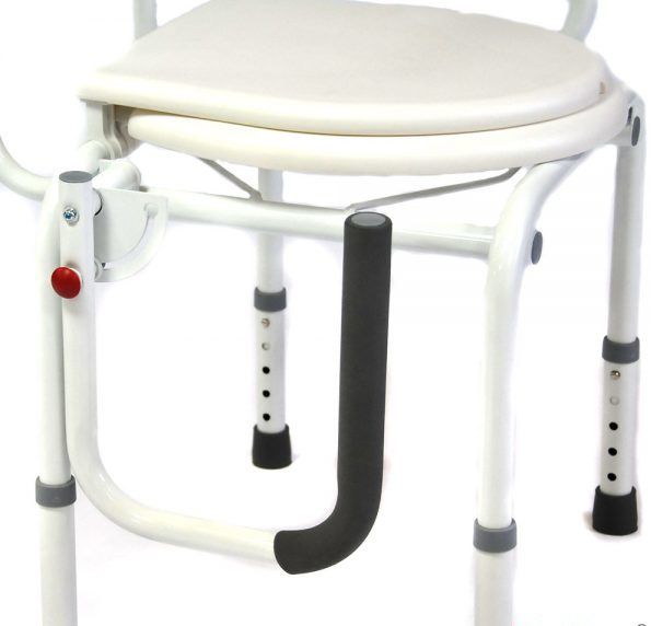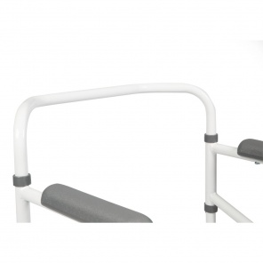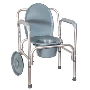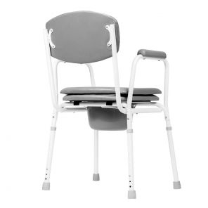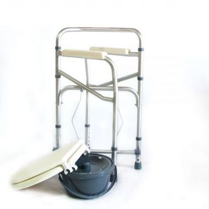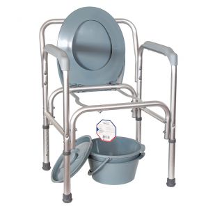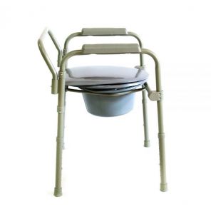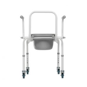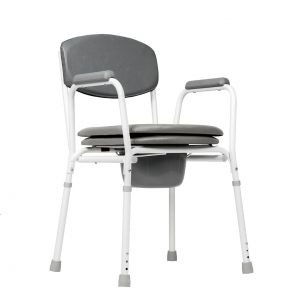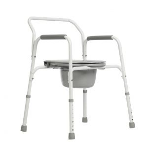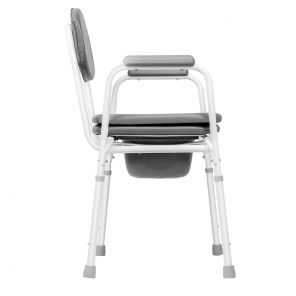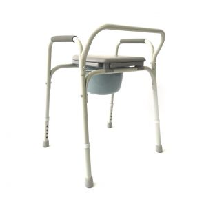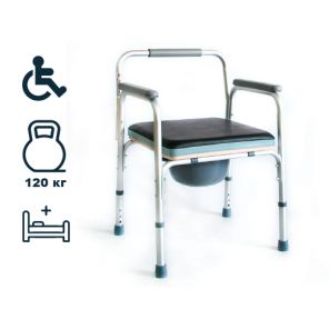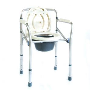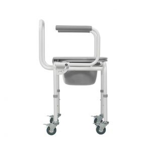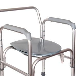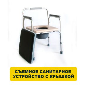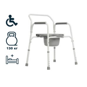 Высота опор регулируется кнопочными фиксаторами. Рама покрыта порошковым составом, защищающим металл от коррозии и повреждений. Санитарное оснащение пластиковое, выдерживает частые дезинфекции и гигиеническую обработку. Опускающиеся подлокотники обеспечивают свободное перемещение пациента из кресла. Устойчивость конструкции придают прорезиненные наконечники, расположенные на ножках кресла.