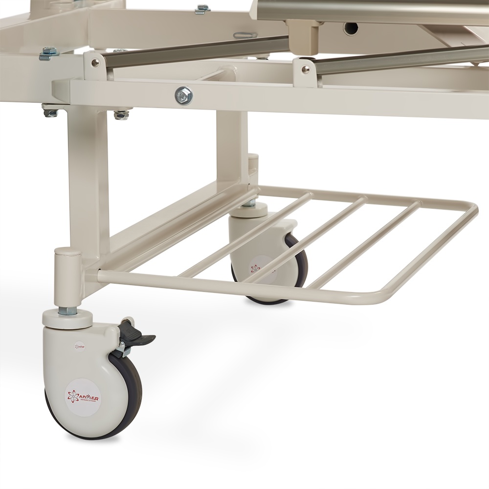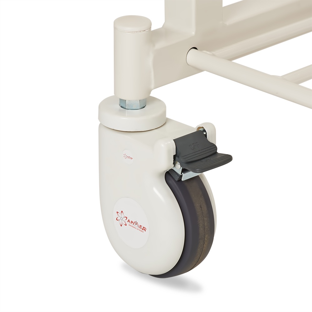 Кровать Armed FS3031W используется для наблюдения за пациентом во время прохождения лечения и в период после операций. Кровать разделена на четыре секции, положение которых регулируется механическим приводом. Выдвижные ручки для поднятия ложа располагаются под основанием кровати, надежно закреплены для безопасности пользователя. Каркас стальной, с поперечными перфорированными ложементами. Съемные торцевые спинки изготовлены из ABS-пластика. Имеют декоративные элементы и защитные накладки на углы. Боковые ограждения складываются кнопочным фиксатором и обеспечивают полный доступ к пациенту. Колеса оборудованы стояночным тормозом.