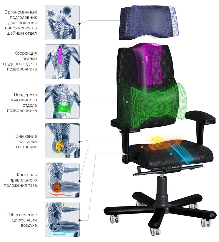Конструкция кресел повторяет естественное анатомические контуры Вашего тела, корректирует осанку, предупреждает возникновение и развитие заболеваний позвоночника и гарантирует здоровый комфорт.