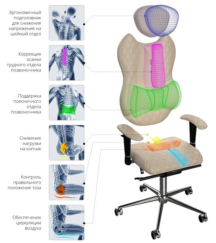 Конфигурация сиденья стула способствует правильному положению таза и обеспечивает циркуляцию воздуха.