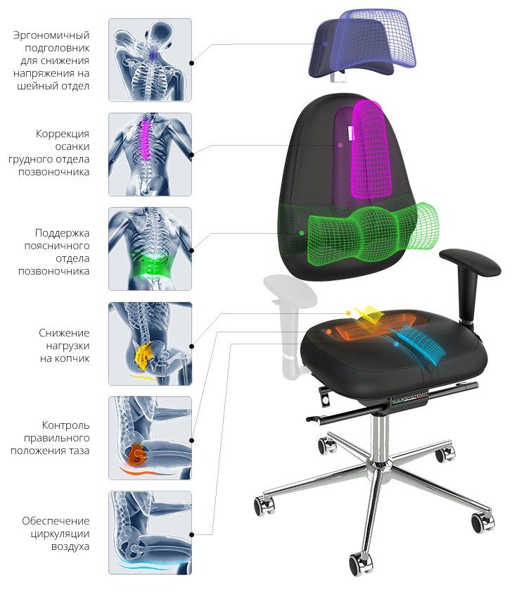 Кресло Kulik-System гарантирует полноценный отдых спине. Конструкция кресла повторяет естественные анатомические контуры вашего тела, корректирует осанку, предупреждает возникновение и развитие болезней позвоночника и гарантирует здоровье и комфорт.
