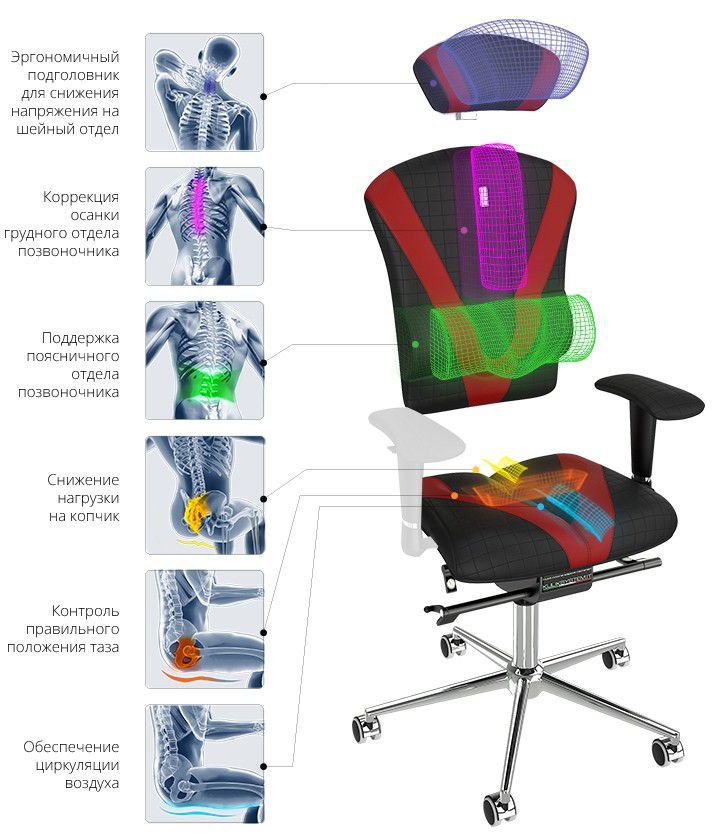 Спинка ортопедического кресла сконфигурирована для коррекции осанки грудного отдела позвоночника, а также для поддержки поясничного отдела позвоночника. Защищает позвоночник от мышечного напряжения, снижает нагрузку на кобчик, расслабляет межпозвоночные диски, тем самым снижая чувство усталости от продолжительного сидения и предупреждая возникновение и развитие заболеваний позвоночника.