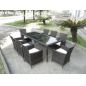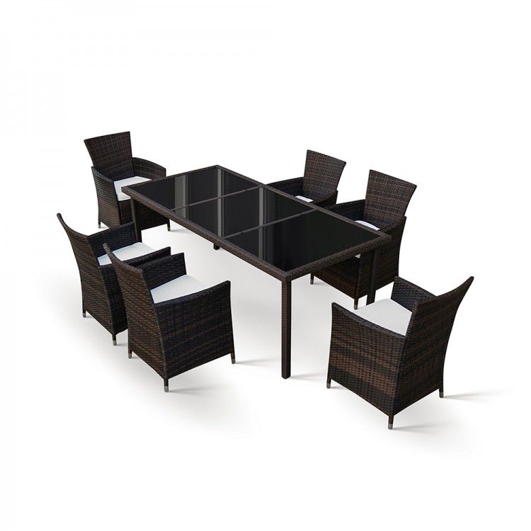 Обеденная группа на 6 персон. В комплект входят 1 стол со стеклянной столешницей толщиной 5 мм с черным закаленным стеклом и 6 стульев с подушками, толщина сидения подушки 4 см.