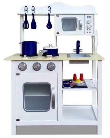 Если вы не готовы покупать большую кухню, а ваша юная хозяйка очень любит готовить, то этот вариант детской игровой кухни именно для вас. Нежно-розовое цветовое решение с яркими акцентами привлекает взгляд. Данная модель полностью укомплектована посудой, есть духовка, шкафчики, раковина и микроволновая печь.
